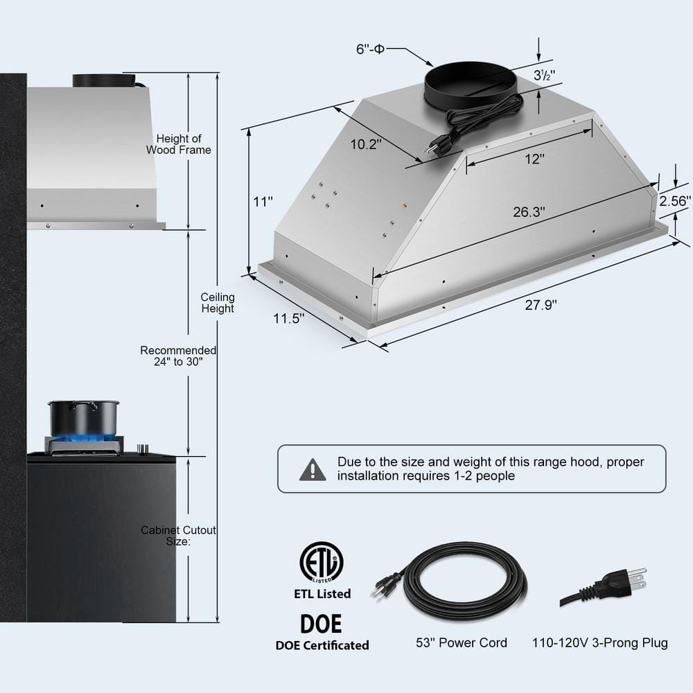 HGUOQ 30 in. 400CFM Convertible Ductless to Ducted Insert Range Hood in Stainless Steel with LED Lights and Washable Filter