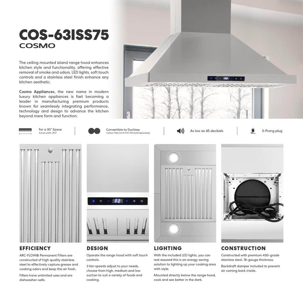Presenting the newest addition to the Cosmo line of stylish professional filtering systems. This 30 in. stainless steel Island Range Hood is in a class of its own. Coveted by kitchen design experts for its sophistication and ultra-modern aesthetic that seamlessly complement a variety of kitchen designs. Its modern features include commercial grade 430 stainless steel and a 380 CFM centrifugal motor dedicated to ridding your house of lingering aromas. Dishwasher-safe premium stainless steel baffle filters to trap grease and oil. 4 x 2W LED lighting to illuminate your cooktop. Includes 3-prong power plug for easy use. Part of the Lumin Collection bringing enhanced functionality and design, offering a well-rounded option for those looking for more convenience and style in an appliance.