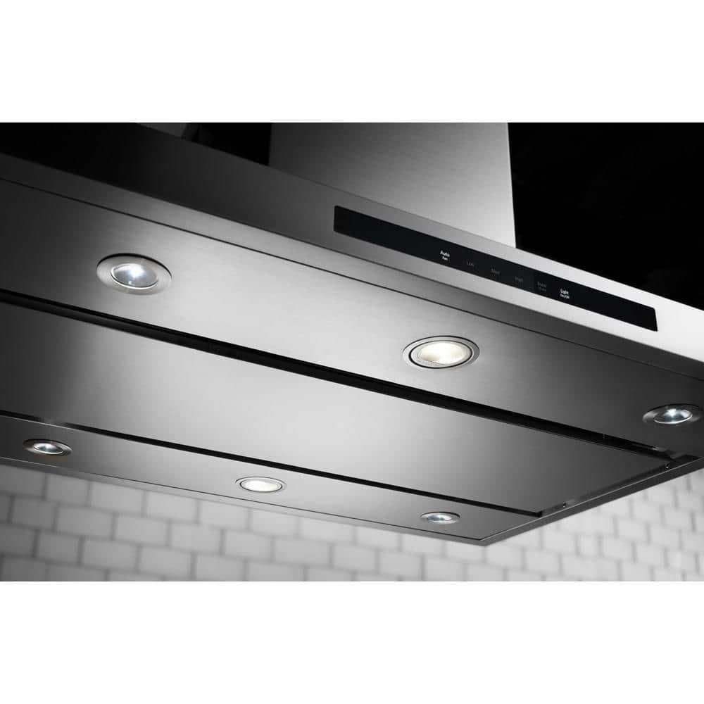 This 36 in. KitchenAid ventilation hood is ideal over an island cooktop or range. You'll get a powerful motor to handle your most aromatic ingredients with a Whisper Quiet System that operates at levels that allow you to carry on a conversation: just 49 dBA (1.5 sones) at Low Speed, is 65 dBA (5.4 sones) at Maximum Speed. Plus Auto Sense allows the range hood fan to turn on automatically when it senses heat higher than its allowable temperature limit. When Auto Sense is On, the fan speed will increase or decrease based on the temperature Auto Sense is measuring.