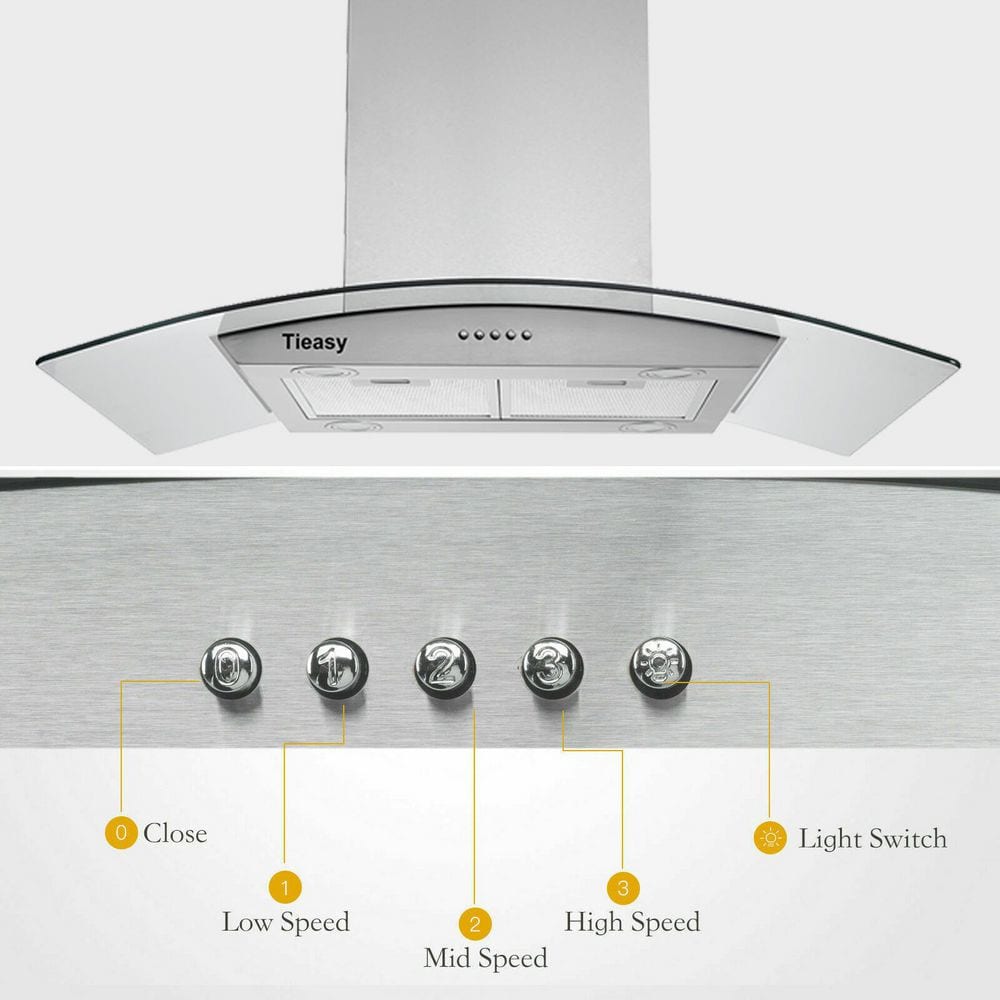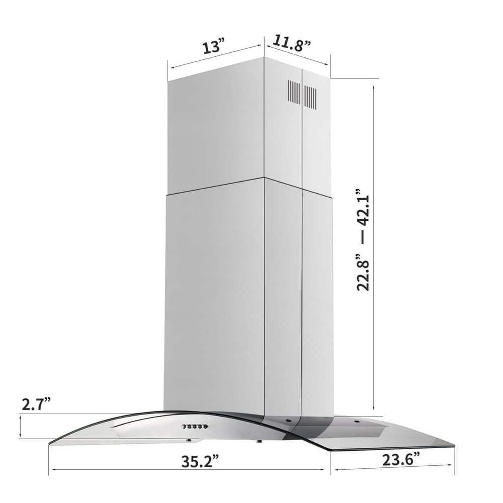 About this itemIsland Mount Installation: 36 inch stainless steel & tempered glass range hood, island mount installation add a modern or professional style for your kitchen.Powerful and Quiet Motor: 3 speed exhaust fan with Max. 700 CFM air flow, less than 65dB at high speed, this kitchen exhaust hood provides a relaxing cooking time.Adjustable Chimney: Extendable chimney can be adjusted to reach 7.5' - 9.5' ceiling, a 6 inch diameter ducting kit convenient vent outside, this range hood gives you a air fresh kitchen area.High Quality: Made of 430-grade brushed stainless steel and tempered glass, this vent hood comes with 4 bright led lights & 2 removable filters. Push button panel control for easy and convenient use.Range Hood Dimensions: 35.2" (W) x 23.6" (L) x 25.8"-42.1"(adjustable height). Including prong plug, manual, hardware, and air backdraft damper. 1 years limited parts warranty.