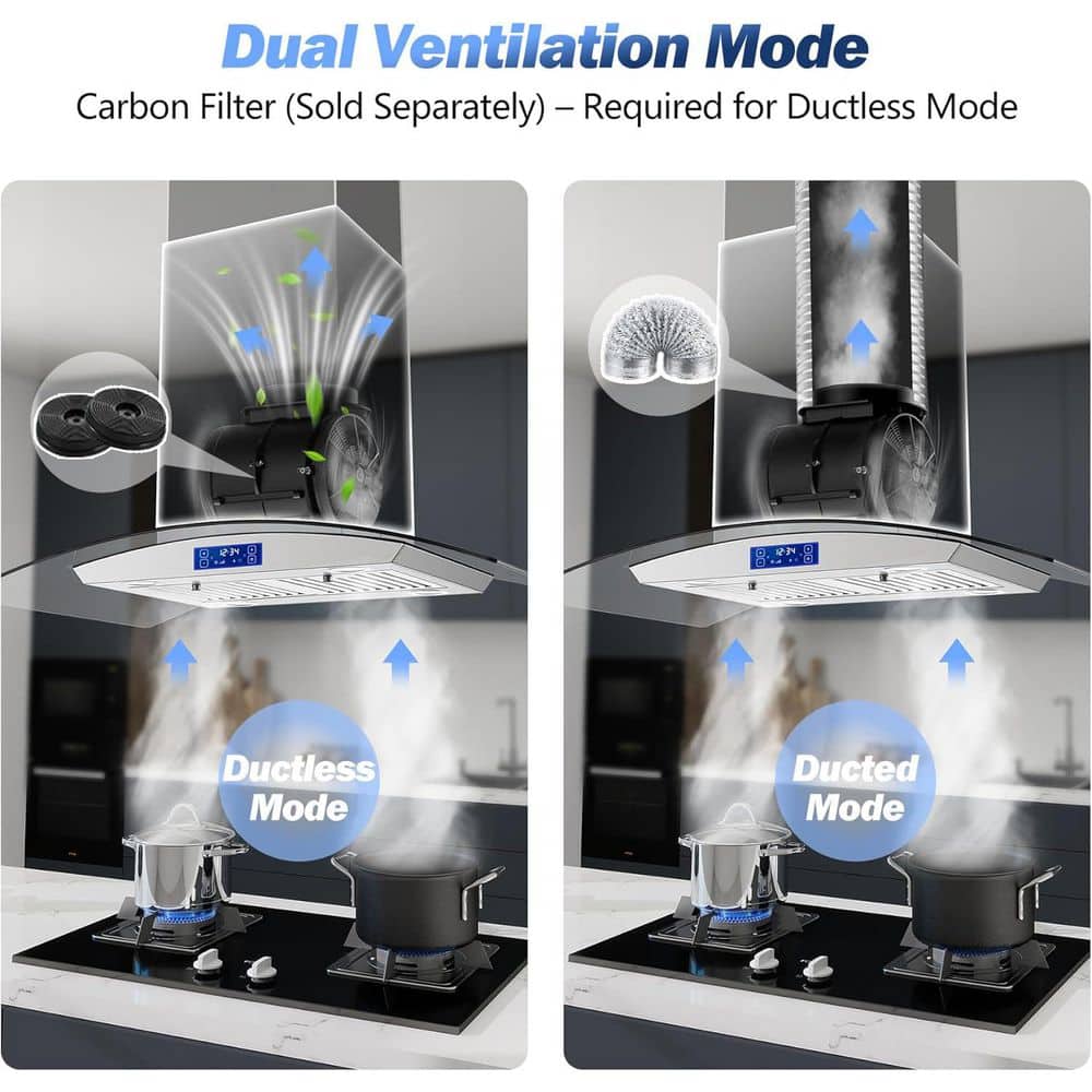Unbranded 36 in 900CFM Ducted Insert Range Hood in Sliver Stainless Steel Island Mount Range Hood Tempered Glass LED Lights