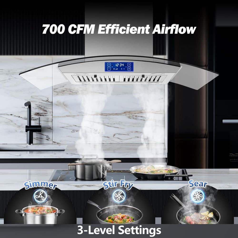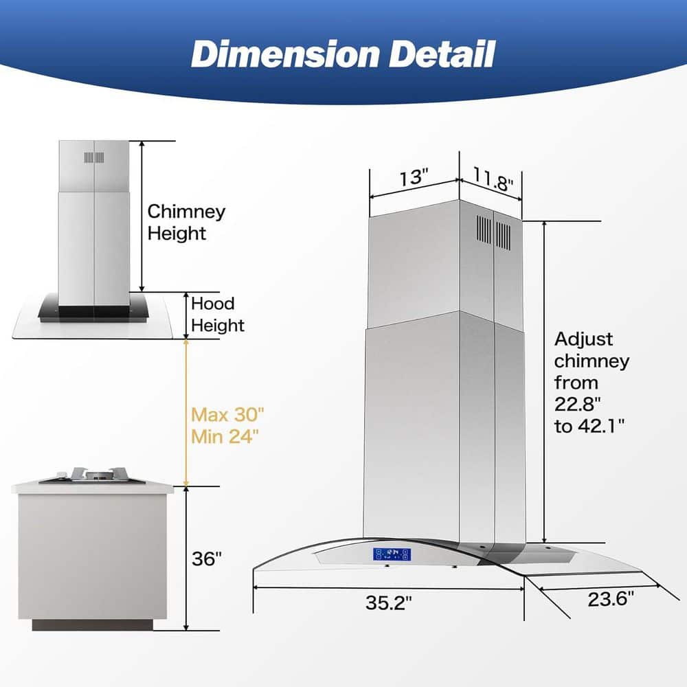 About this item700CFM airflow: Powerful suction at 700CFM, enough to capture smoke, steam grease and heat from your kitchen air. Vent hood is designed for different kitchen decoration styles and away featured the high suction and high-ends switch 3-speed fansSuper bright LED light: There are 4 highly efficient and bright LED lights in island kitchen hood, when you are cooking several dishes at once, any cooking area can be illumined. Touch switch control also easy to operate and cleanUltra-quiet operation: Lowest noise only 65db at high speed, keep quiet when you cook in the morning. Stainless steel filters to trap cooking grease and oil, easily removable and dishwasher safer save your clean timeAdjustable chimney: Extendable chimney hood can be adjusted to reach 7.5' - 9.5' ceiling, kitchen extraction fan also comes with a 6 inch diameter ducting kit convenient vent outsideEasy installation: Cooker hood dimensions is 35.2''(W) x 23.6''(L) x 25.8''-42.1''(adjustable height). Including prong plug, manual, hardware, and air backdraft damper. Providing 1 years limited parts warranty