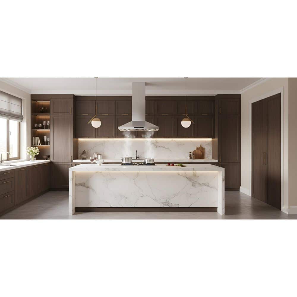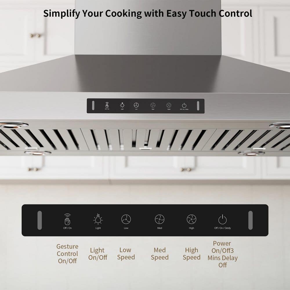 This professional island range hood features an advanced touch panel and gesture sensing technology. With its powerful motors and upgraded ventilation system, it effortlessly extracts odors and smoke from your kitchen while keeping noise to a minimum.The sleek stainless steel body adds a touch of elegance to your kitchen while offering excellent resistance to deformation, ensuring lasting beauty and functionality. Even in high-temperature, heavy-duty cooking environments, it remains unaffected by heat and chemicals. The snap-on baffle filters capture all the grease from the smoke and are dishwasher-safe for easy cleaning. You can cook your favorite dishes without worrying about toxic smells, greasy particles, or stained cabinets.The 380 CFM powerful suction, LED light, delay-off timer, and memory function offer all the features you need for a convenient cooking experience. With its stable performance and easy maintenance, it's clear that this range hood is built for long-term use. We know how valuable your time is, and by choosing this professional range hood, you'll save the time you might otherwise spend on "searching."
