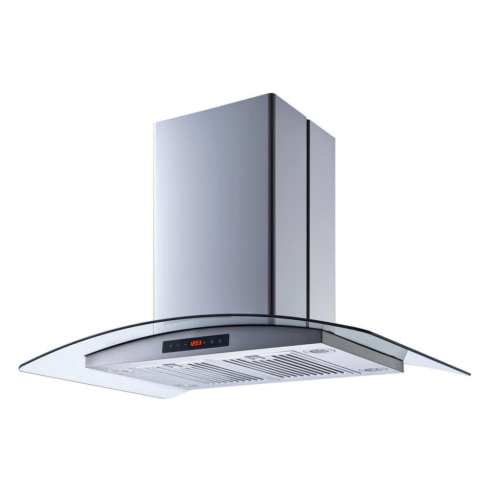 This beautiful 36 in. European design island mounted range hood will create splendor and elegance in your kitchen. Constructed of high quality 430 stainless steel and clear tempered glass. Complete with unique curved design aluminum mesh filter with decorative stainless steel panel that removes smoke and grease from your cooking area and are dishwasher safe. Powerful suction with 600 CFM air flow rate (max velocity) is perfect for household use and an ideal balance between power, energy efficiency and noise control. This model also comes with 4 bright energy saver LED lights, low noise level operation, touch sensor control panel and 3-level fan speed. This range hood comes with all the parts you need for easy installation. Adjustable chimney can fit 8 ft. to 9 ft. ceiling. This unit is convertible, can be vented out of your dwelling or recirculating (ductless) with charcoal filters (included, part # WRHF004S2).
