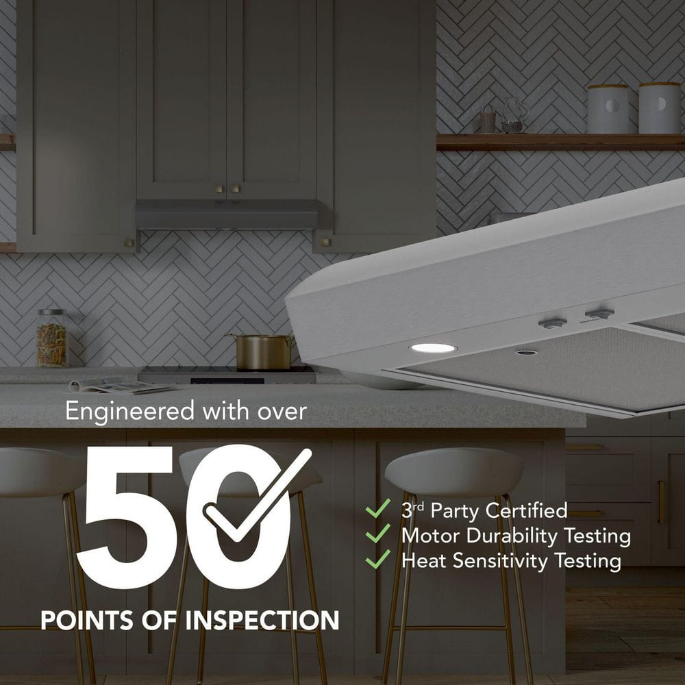 From the leader in residential indoor air quality, this under-cabinet range hood by Broan-NuTone is built to surpass industry standards with over 50-points of inspection, engineered as a reliable ventilation solution. The durable hood vent is up to 20% more effective at removing pollutants than the leading competitor with power ventilation at 350-Max Blower CFM to capture and remove smoke and odors from the kitchen. The Mantra range hood is also up to 44% quieter: 1.5 sones is equivalent to a refrigerator running, so it won't interfere with daily life. The EZ1 Install System allows for a quick and easy 1-person installation, and the ENERGY STAR Certification is both code compliant and provides cost savings. The 1-Level LED lighting and a 2-Speed hidden rocker controls make cooking a breeze. At BROAN-NuTone we believe that better quality of air means better quality of life.
