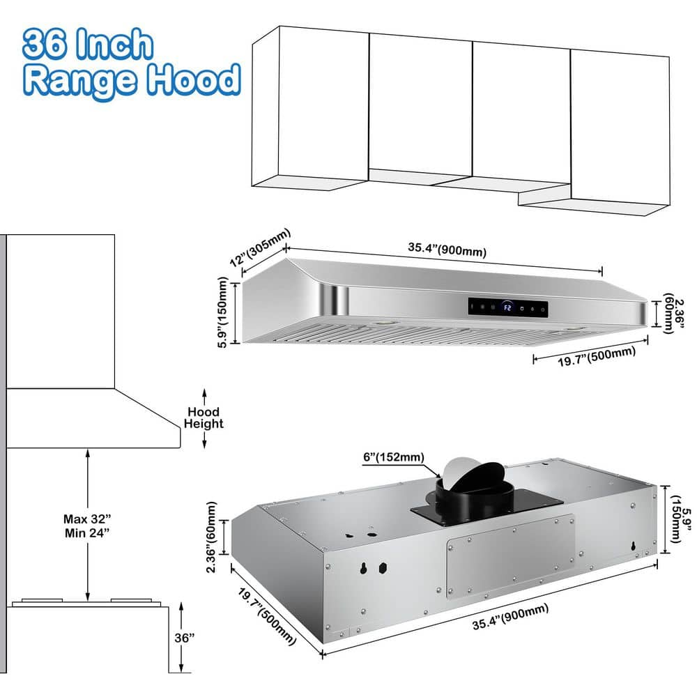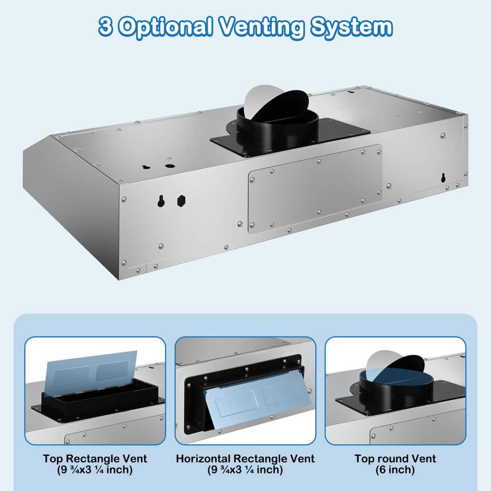 Hooure 36 in. 1200 CFM Convertible Under Cabinet Range Hood in Stainless Steel with 4-Speed Settings, Built-in Oil Cup