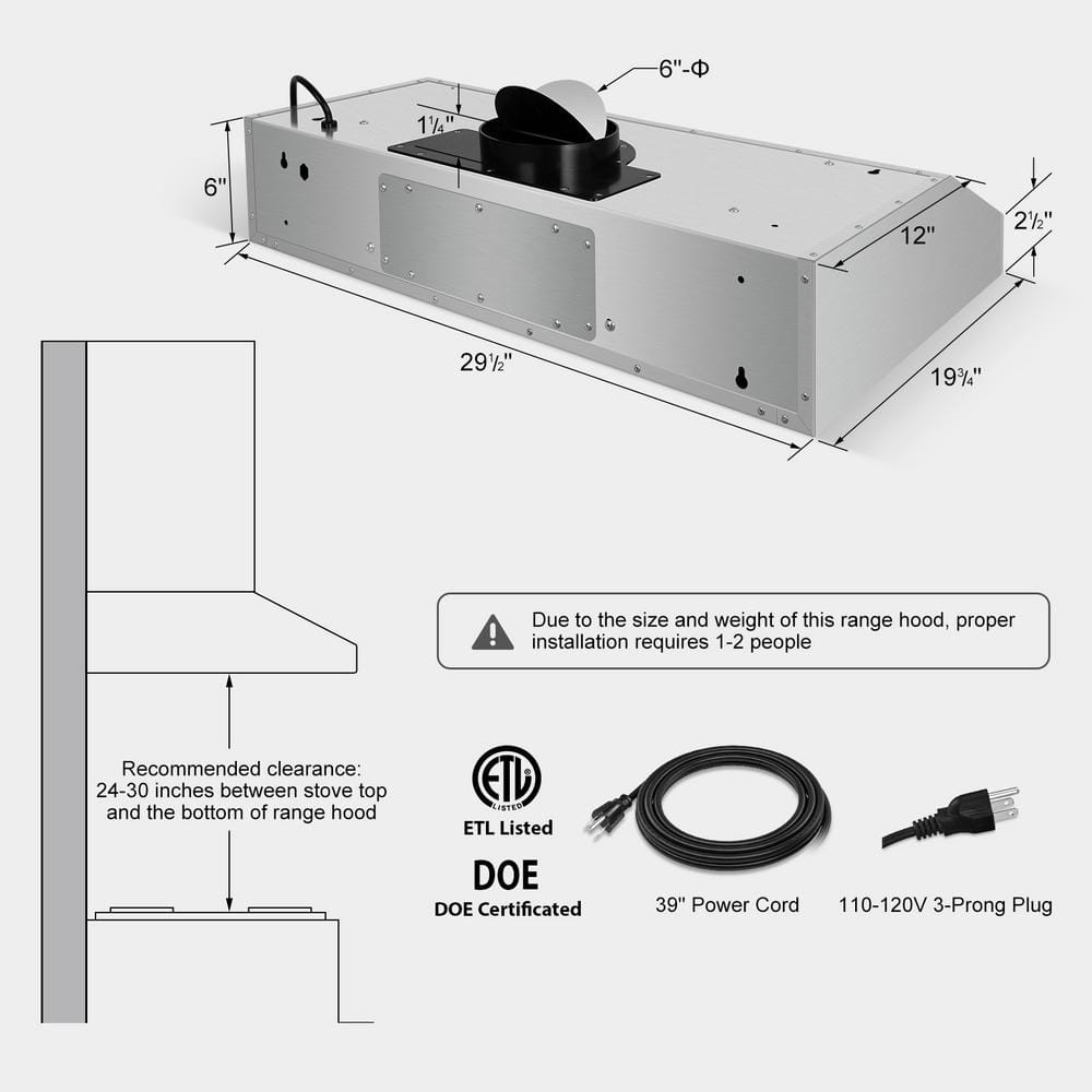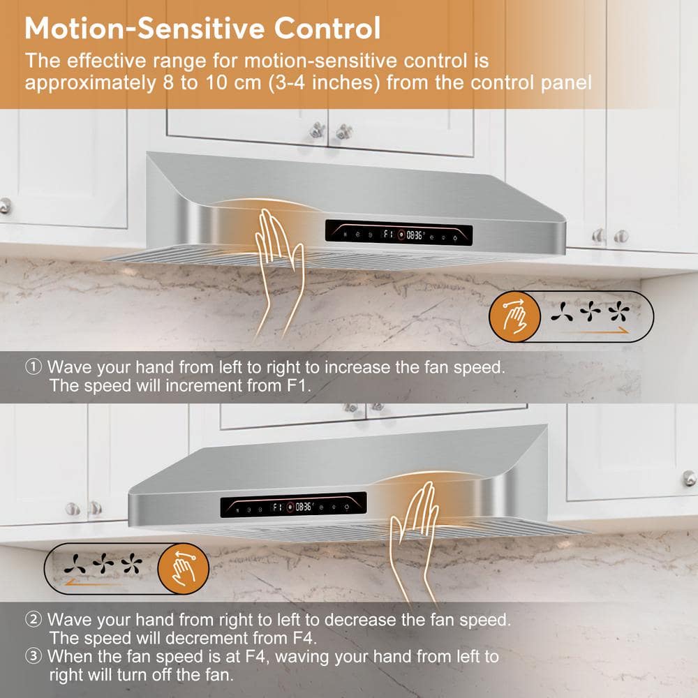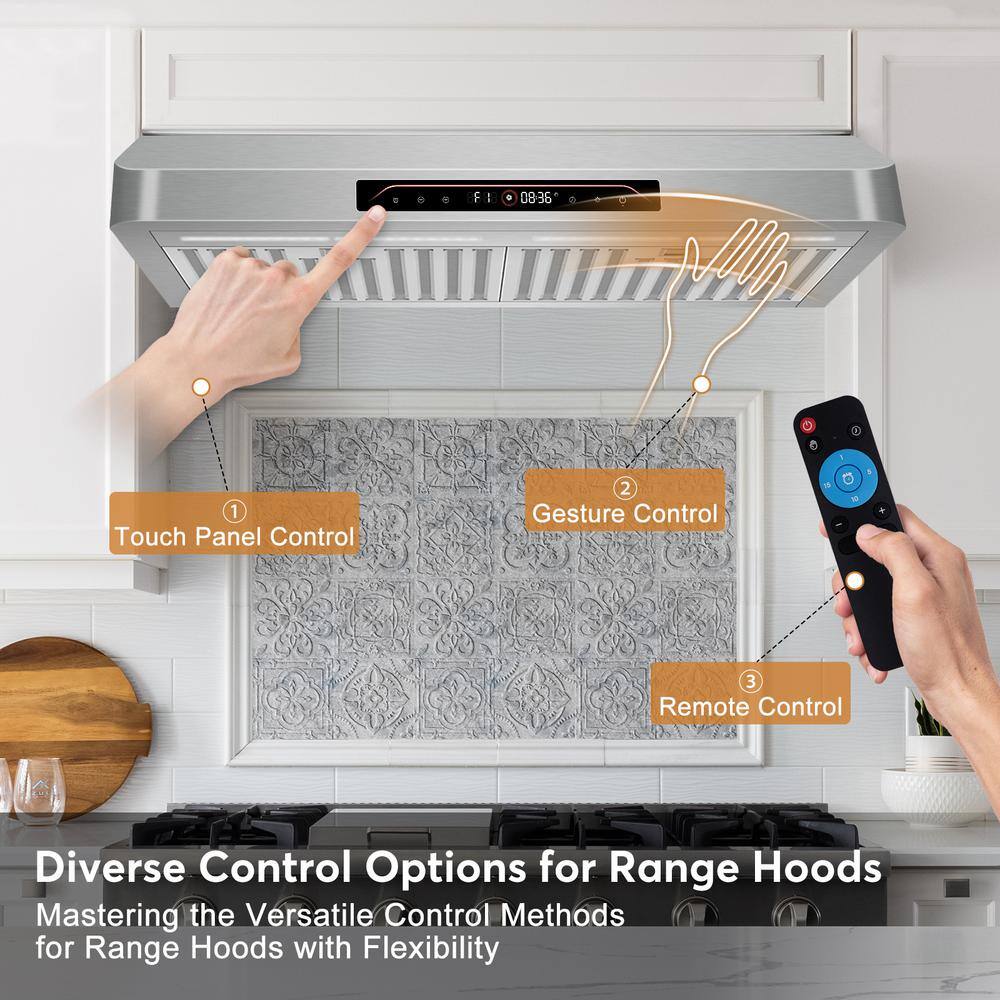Enhance your kitchen experience with our ultramodern 29.5 in. built-in range hood. This powerful ventilator blends seamlessly into your cooking space with unrivaled versatility and performance. The trio of intuitive controls - gesture, touch and infrared wire remote - puts you in control of your kitchen. Easily adjust the 4-speed fan to accomplish any cooking task, from delicate simmering to high-temperature grilling. Bright 2 x 3W LED lights ensure that your cooktop stays lit, while powerful 900 CFM suction easily draws out stubborn fumes and odors. Plus, with 3 ventilation options to choose from, you can install it to suit your kitchen layout. This built-in range hood is crafted to elevate your cooking. Combining form and function, it is the perfect blend of style and substance to complement any modern kitchen. Experience the future of ventilation today.