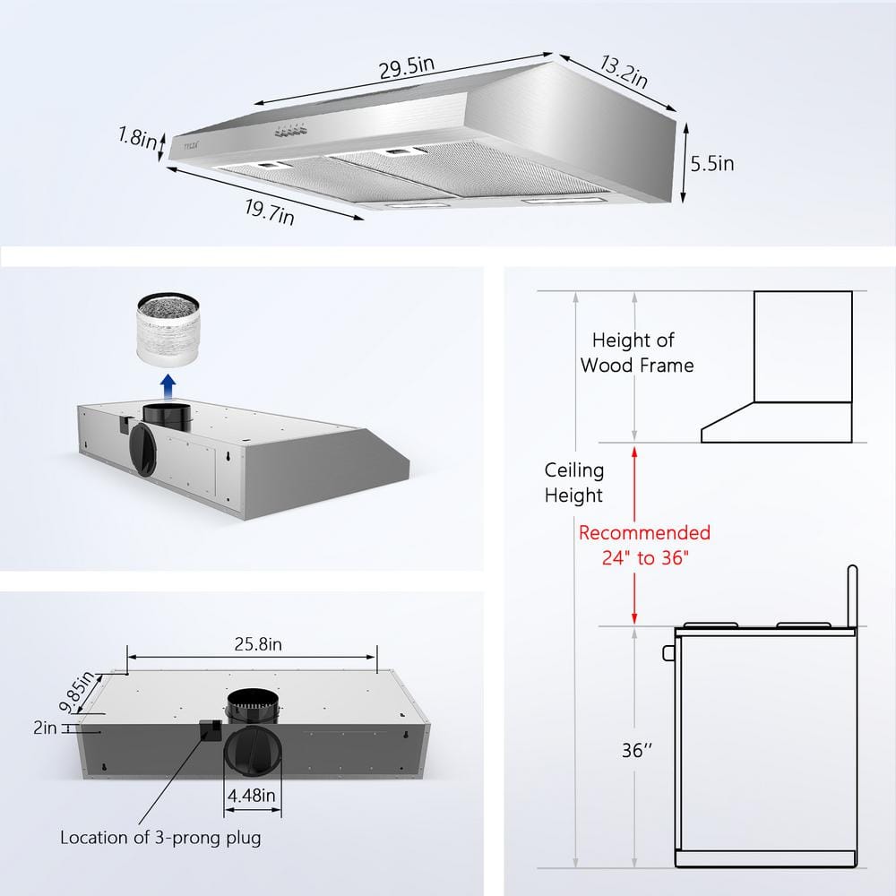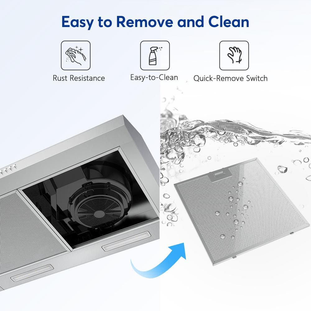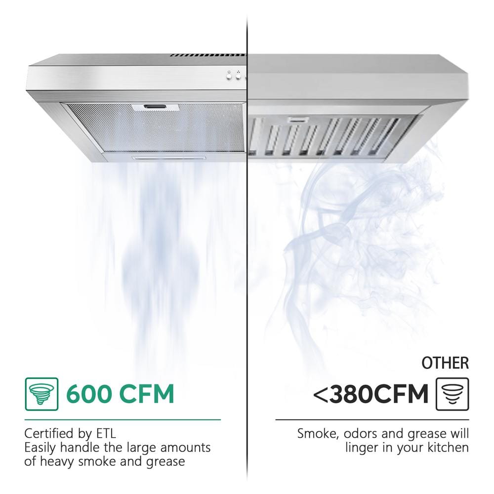 Easily transform your kitchen with our state-of-the-art 30-in. kitchen vent hood, designed to combine functionality and style effortlessly. Featuring a powerful 600 CFM airflow, it efficiently eliminates smoke, grease, and unwanted odors, ensuring a fresh cooking space every time. Its sleek, modern design and intuitive touch controls bring a sophisticated vibe to any kitchen. With adjustable speed settings and a quiet operation at a maximum of 55dB, this vent hood provides the perfect balance of performance and comfort. Elevate your kitchen experience today and enjoy a cleaner, more serene environment for your culinary adventures.