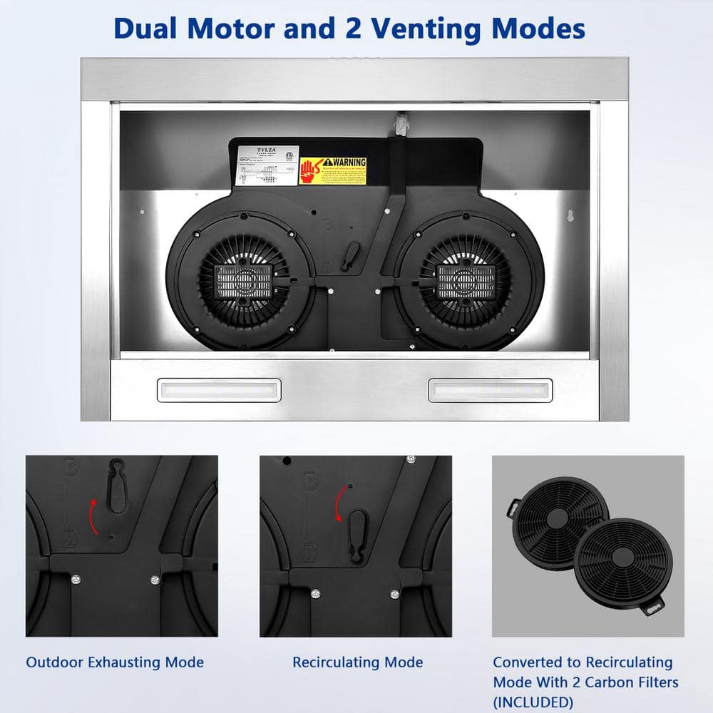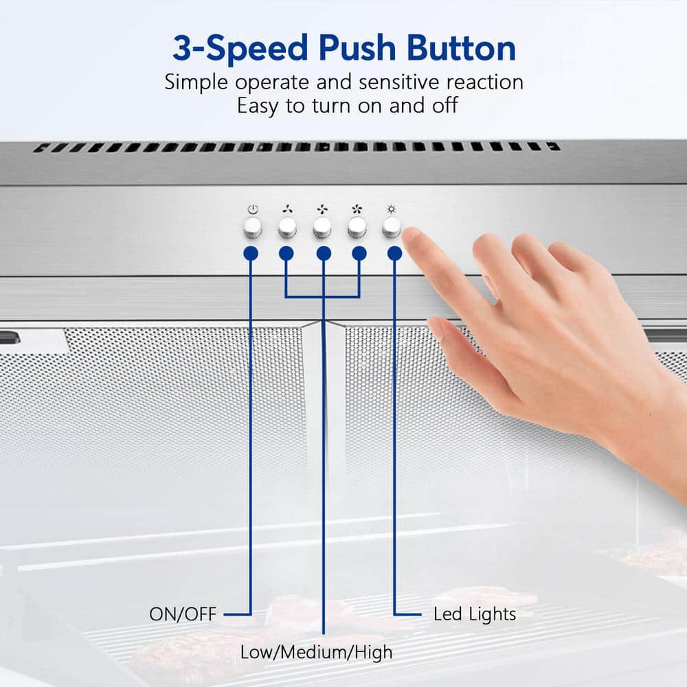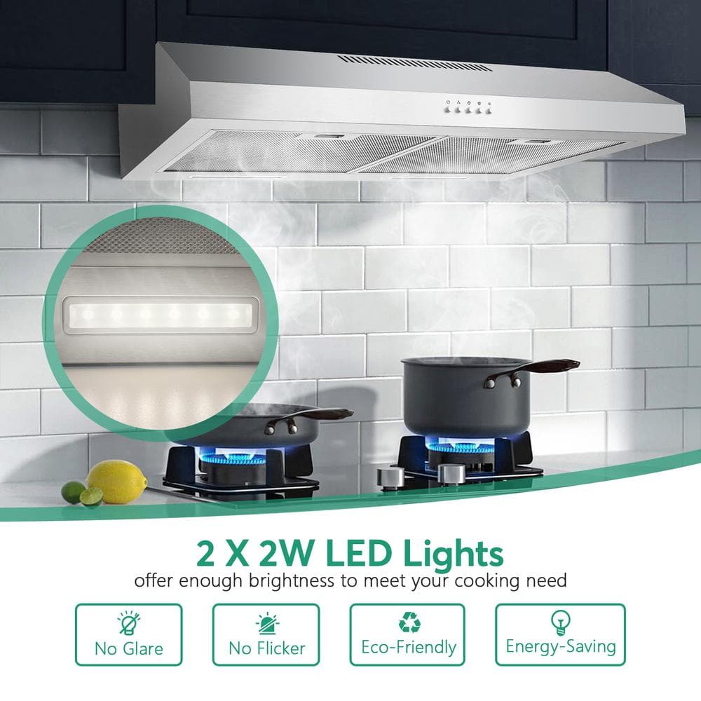 Velivi 30 in. 600 CFM Convertible Ductless Under Cabinet Range Hood With 3 Speed Exhaust Fan and 2 LED Lights, Stainless Steel
