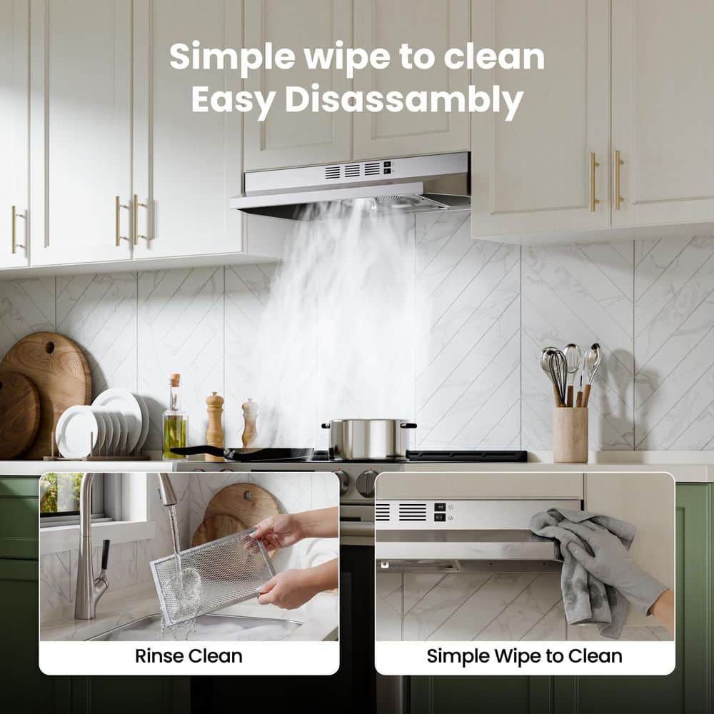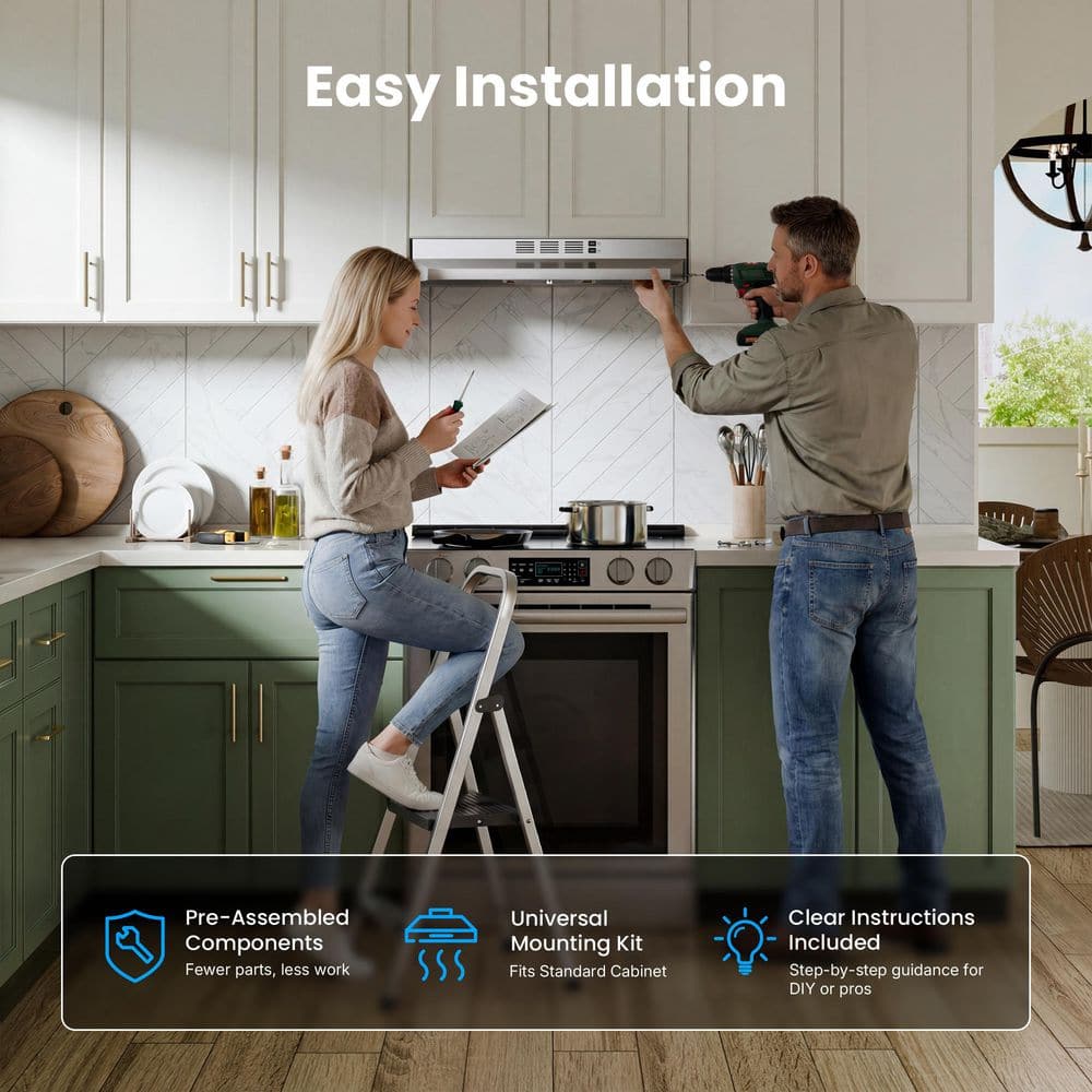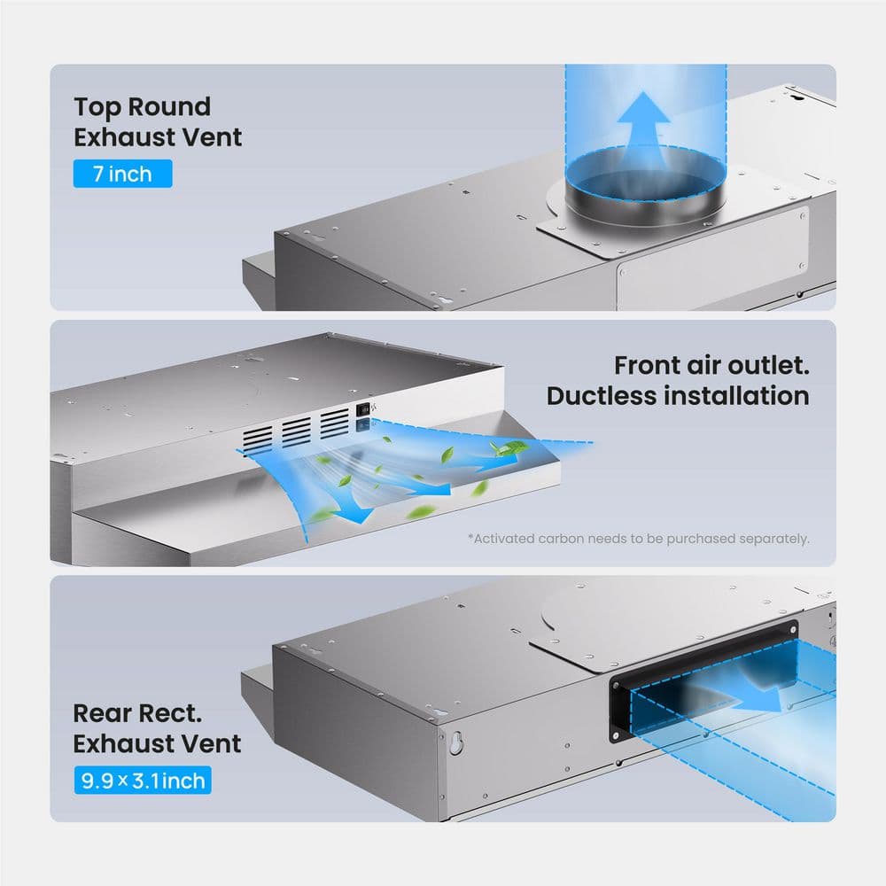 This 30 in. under cabinet stainless steel range hood features a modern low-profile design and durable construction for everyday kitchen ventilation. Designed as stove range hood, it delivers 300 CFM airflow to help remove smoke, steam, and cooking odors during daily cooking tasks. The 2-speed Exhaust Fan and mechanical control allows you to adjust airflow based on your cooking needs, while integrated 5200K LED range hood lighting provides clear illumination over your cooktop. This Kitchen range hood supports both ducted and ductless installation options (carbon filter sold separately), offering flexibility for different kitchen layouts.Ideal for homeowners seeking a practical and stylish kitchen ventilation solution, this range hood combines efficient airflow, simple operation, and a clean stainless steel finish to complement modern kitchens.