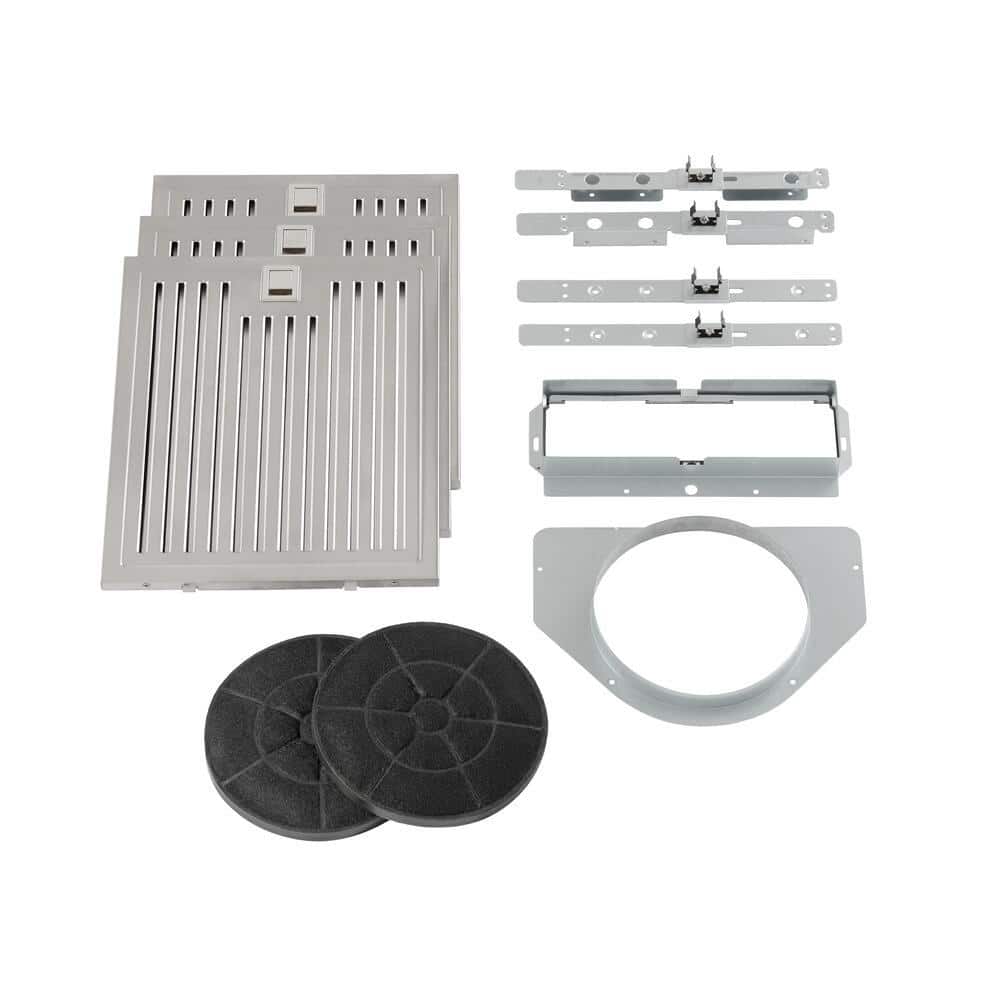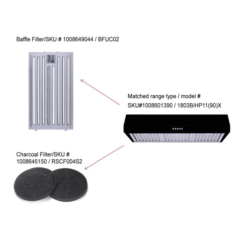 This beautiful kitchen under cabinet range hood is constructed of premium powder coated steel . Powerful suction with a 500 CFM air flow rate and dishwasher safe stainless steel baffle filters to remove smoke and grease from your cooking area. The range hood also comes with 2 energy saver soft white bright LED lights, low noise level operation, and 3-level fan speeds. It's perfect for household use and an ideal balance between power, energy efficiency and noise control. This unit includes a carbon/charcoal filter kit for ductless recirculating installations or to help reduce odors.(Carbon/charcoal filter,Part#1008645150)