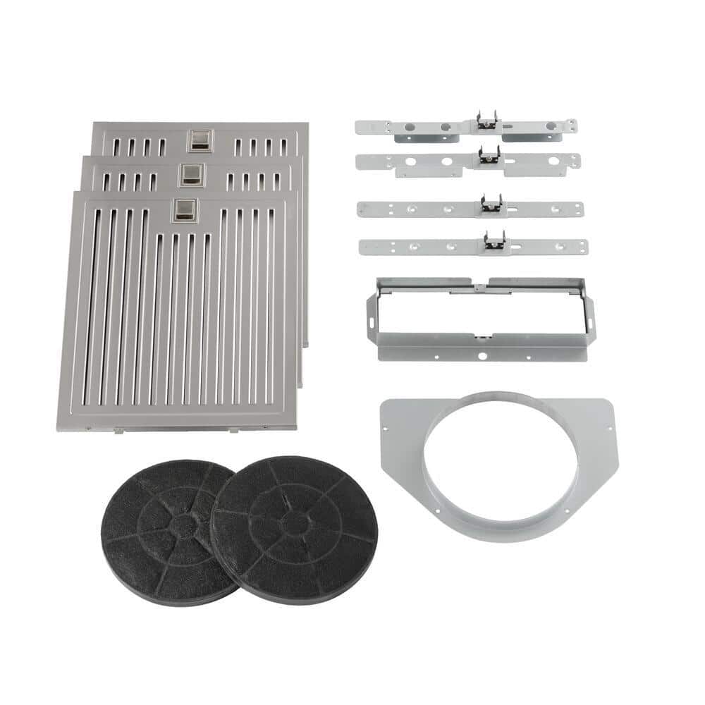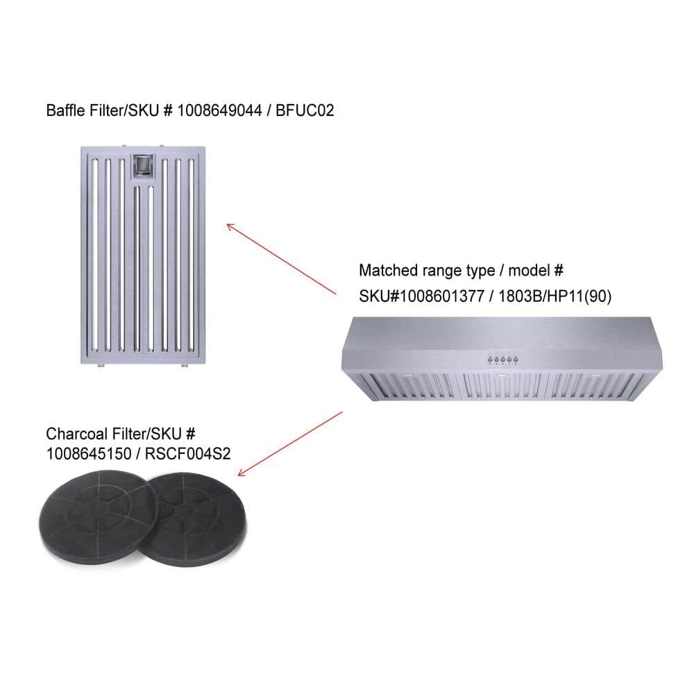 This beautiful kitchen under cabinet range hood is constructed of premium 430 stainless steel. Powerful suction with a 500 CFM air flow rate and dishwasher safe stainless steel baffle filters to remove smoke and grease from your cooking area. The range hood also comes with 2 energy saver soft white bright LED lights, low noise level operation, and 3-level fan speeds. It's perfect for household use and an ideal balance between power, energy efficiency and noise control. This unit includes a carbon/charcoal filter kit for ductless recirculating installations or to help reduce odors.(Carbon/charcoal filter,Part#1008645150)