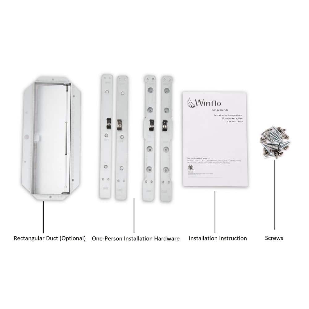 This white 30 in. under cabinet range hood features a contemporary European slim design constructed of premium powder coating steel. The range hood features a patented design ventilation system to provide powerful suction with 400 CFM air flow and effortlessly remove smoke, odors and grease. Winflo patented Quick-install hardware is included to make installation by one person a breeze. 2 bright energy saver LED lights illuminate your cooking area and a push button panel controls 3 fan speeds and light. Easy to remove dishwasher-safe aluminum mesh grease filters keep maintenance to a minimum. This range hood provides the maximum performance at minimum cost. The unit is convertible with a simple switch and can be vented out of your dwelling through back or top, or converted to recirculating (ductless) with charcoal filters (part # WRHF004S2, sold separately).
