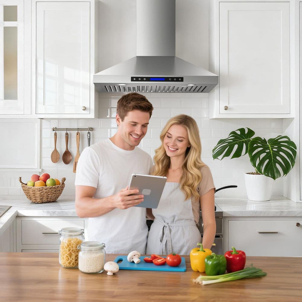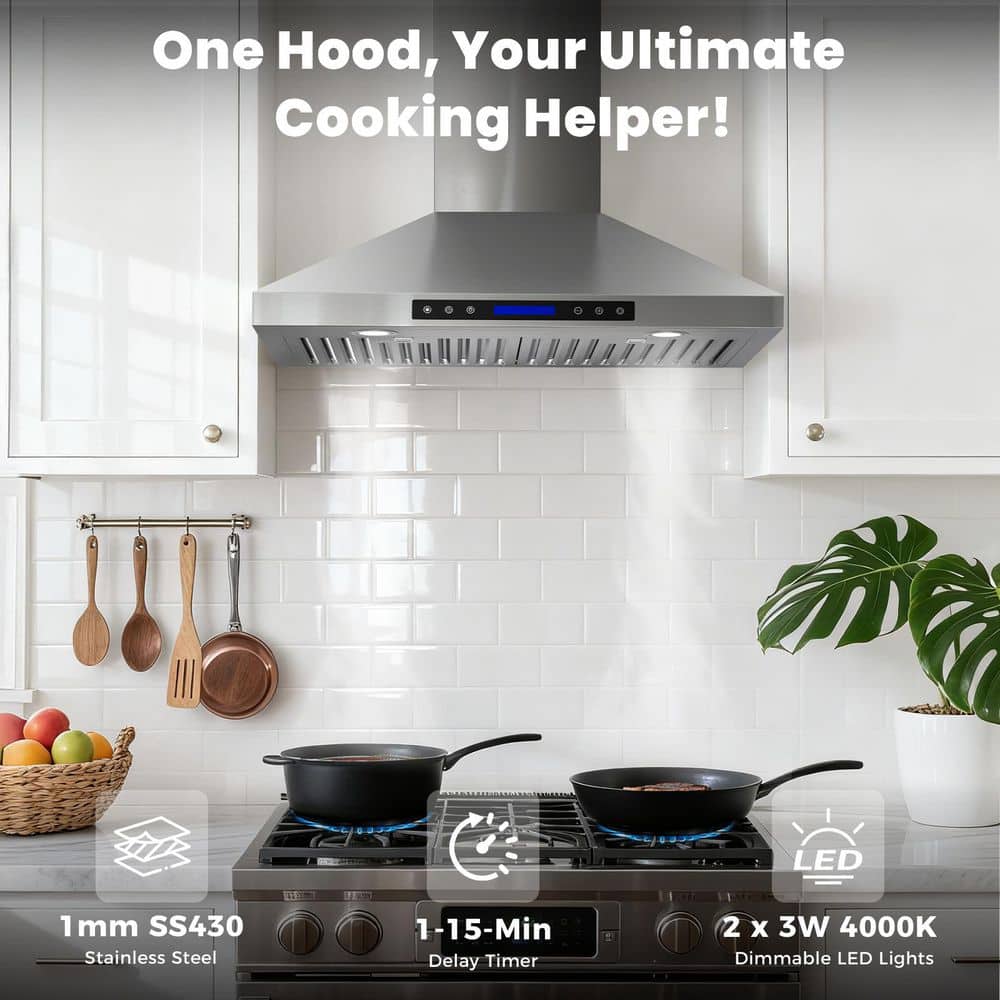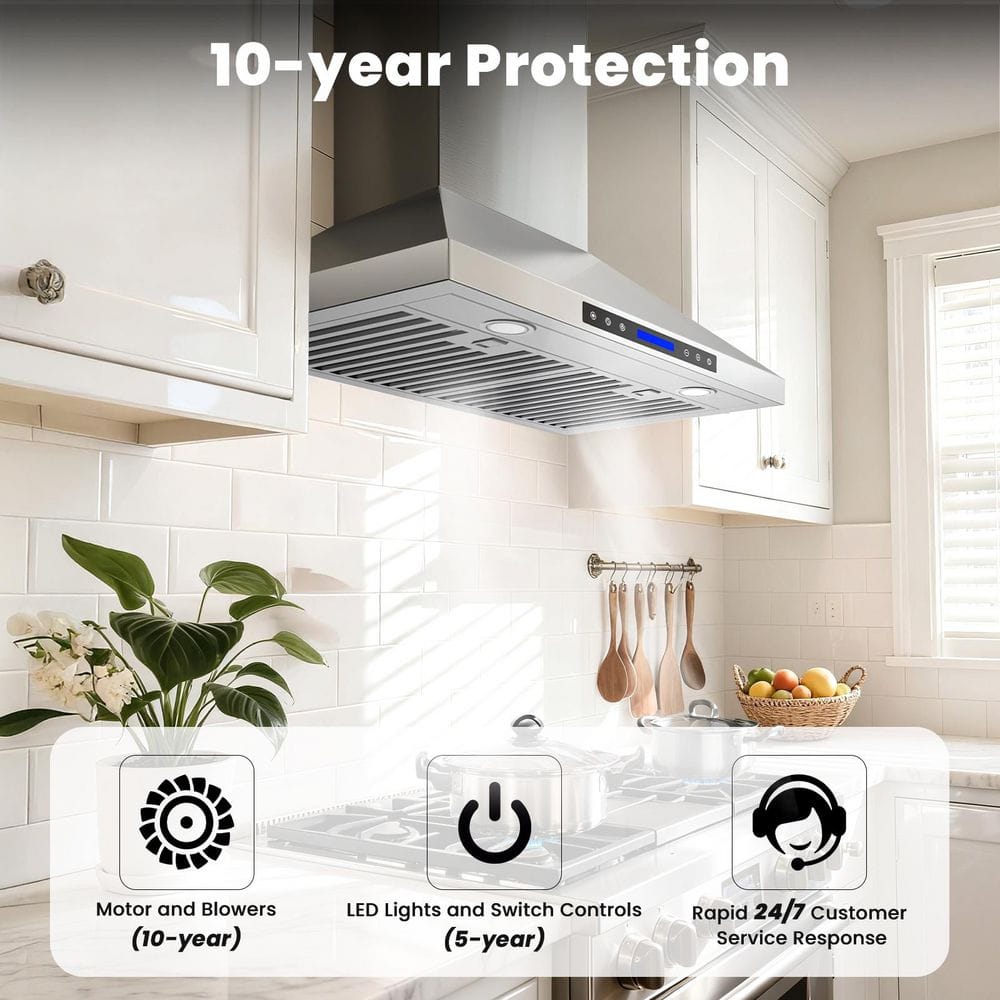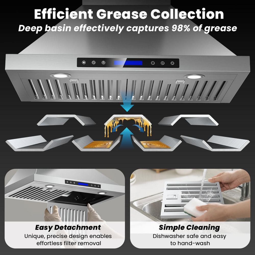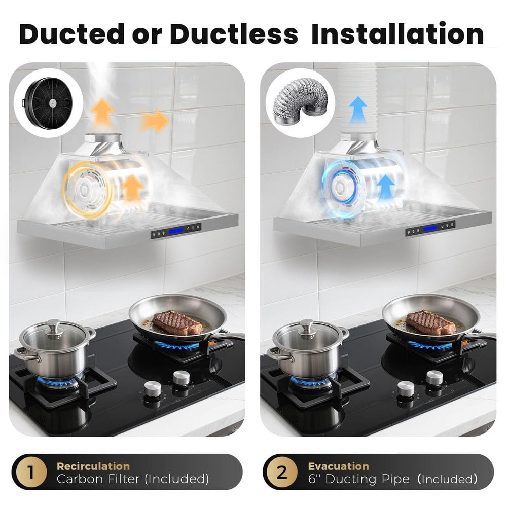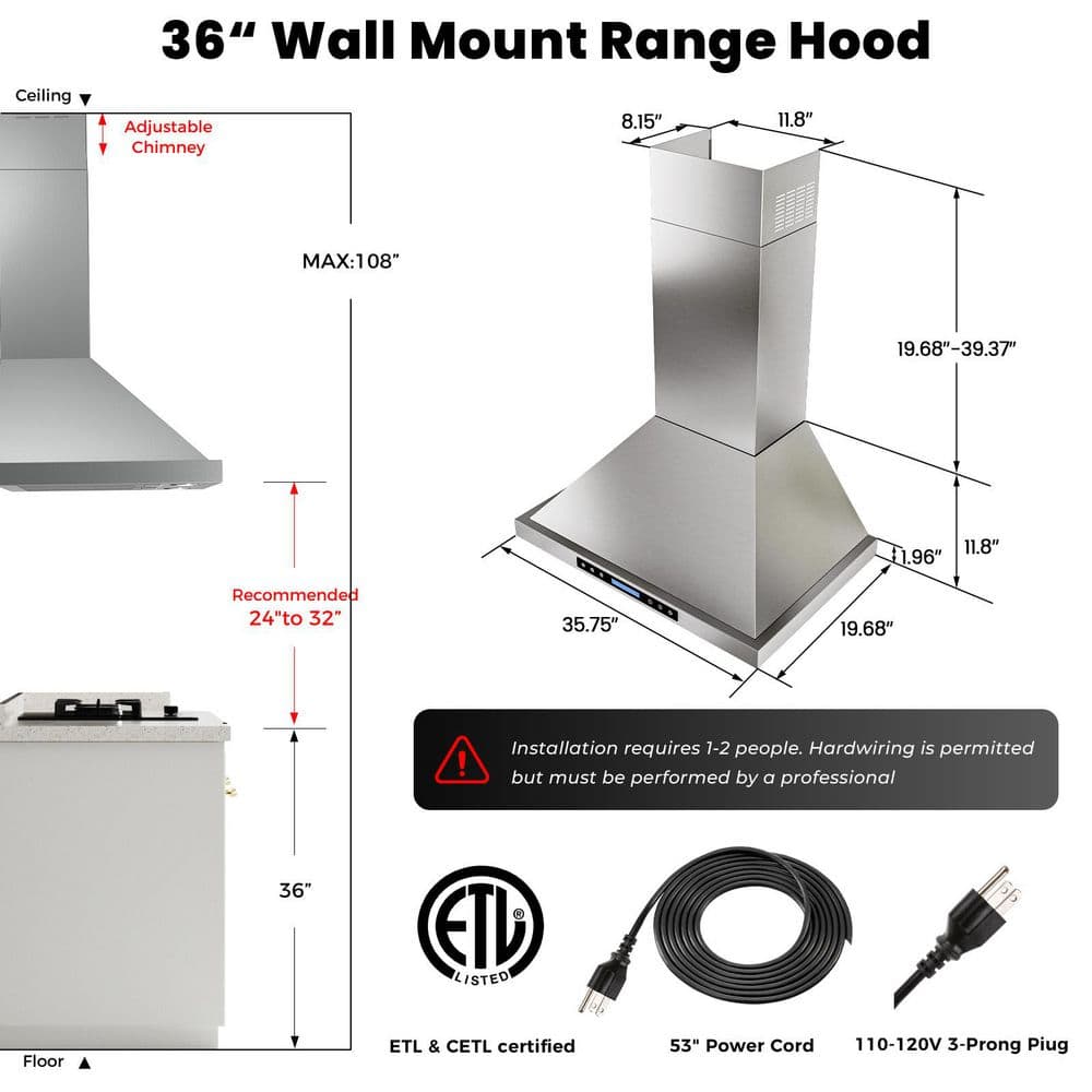 Upgrade your kitchen with this sleek 36-inch range hood, combining powerful 900 CFM suction (clearing 98% of smoke and odors) and ultra-quiet operation at 39-65 dB. Built from durable SS430 stainless steel, it features dishwasher-safe baffle filters, two adjustable 3W 4000K LED lights, and a modern touch panel with wireless remote for effortless control.The hood offers convertible installation (ducted or ductless) with a 6'' adapter and charcoal filter included. An auto-shutoff timer (1-15 minutes) helps clear residual smoke after cooking. ETL & CETL certified with a standard plug, it's ready for US & Canada use, it comes with baffle filters, adapter, screws, and manual. Backed by a 10-year motor warranty and 5-year LED warranty, this range hood promises lasting quality and a fresher kitchen.