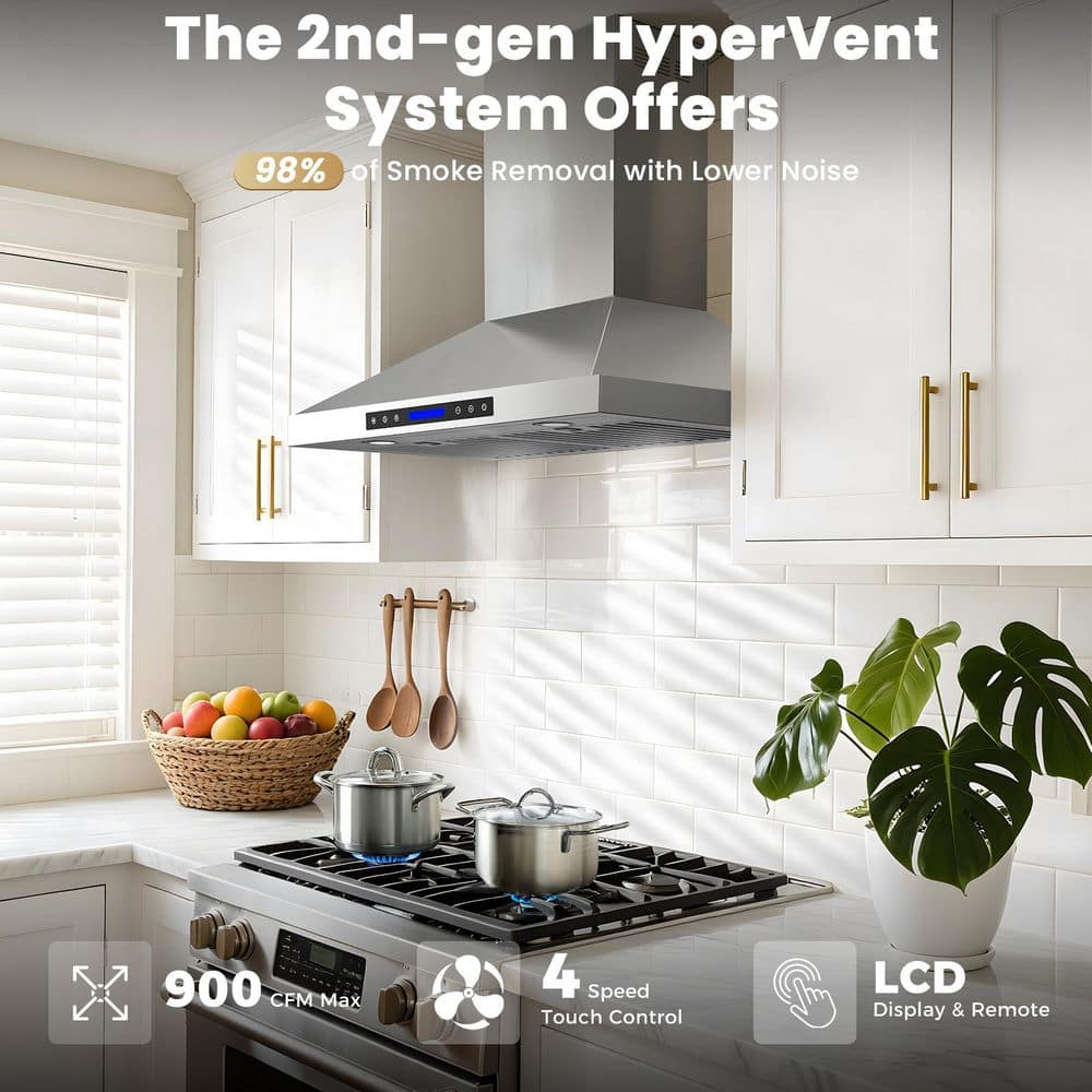 INATECK 36 in. 900 CFM Convertible Wall Mount Range Hood with Remote, Touch Control LCD, Long-term Warranty in Stainless Steel