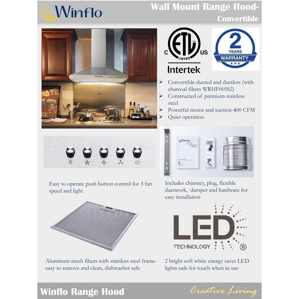 Winflo 30 in. 400 CFM Convertible Wall Mount Range Hood in Stainless Steel with Mesh Filters and Push Button Control