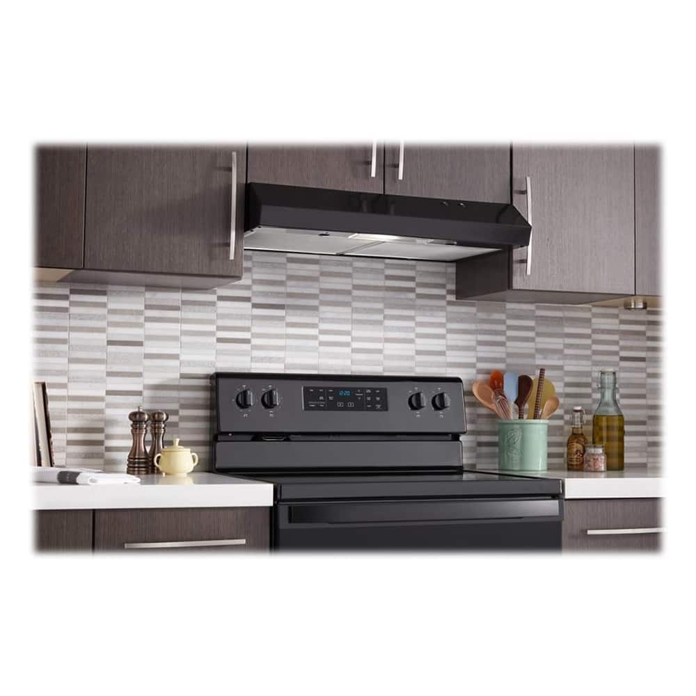 Keep your kitchen smelling fresh with this 30-inch Whirlpool ventilation hood. The full-width dishwasher-safe filters trap grease and particulates for optimum airflow, while LED light provides reliable cooktop illumination. This black Whirlpool ventilation hood boasts a powerful yet quiet two-speed fan for efficient elimination of smoke and odors, and the FIT system coupled with the under-cabinet mounting design ensures easy, seamless installation. How to Measure for a New Appliance A little measuring now can help you avoid delivery headaches later. Watch the video ›