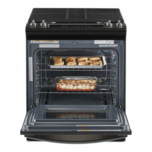Simplify steps in the cooking process with this gas slide in range that lets you skip preheating for frozen favorites with Frozen Bakeâ„¢ Technology. Get more flexibility on the cooktop with two high heat burners and edge-to-edge cast iron stove grates. This range is also equipped with a high-temperature, adjustable self clean oven cycle so you can clean without using chemicals.