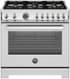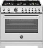 This 36” All Gas range has 6 brass burners and features 2 dual ring 19,000 BTU power-burners, 5.9 cubic feet oven, dual convection fan, 7 shelf levels, digital gauge, temperature probe, telescopic glides, soft-close doors, removable cast-iron griddle is included. All Bertazzoni appliances are covered by a 2-year warranty.