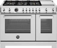 This 48” All Gas range has 6 brass burners with electric griddle and features 2 dual ring 19,000 BTU power-burners, 4.6 cubic feet oven with dual convection fan, 2.4 cubic feet auxiliary oven, 7 shelf levels, digital gauge, temperature probe, telescopic glides, soft-close doors. All Bertazzoni appliances are covered by a 2-year warranty.