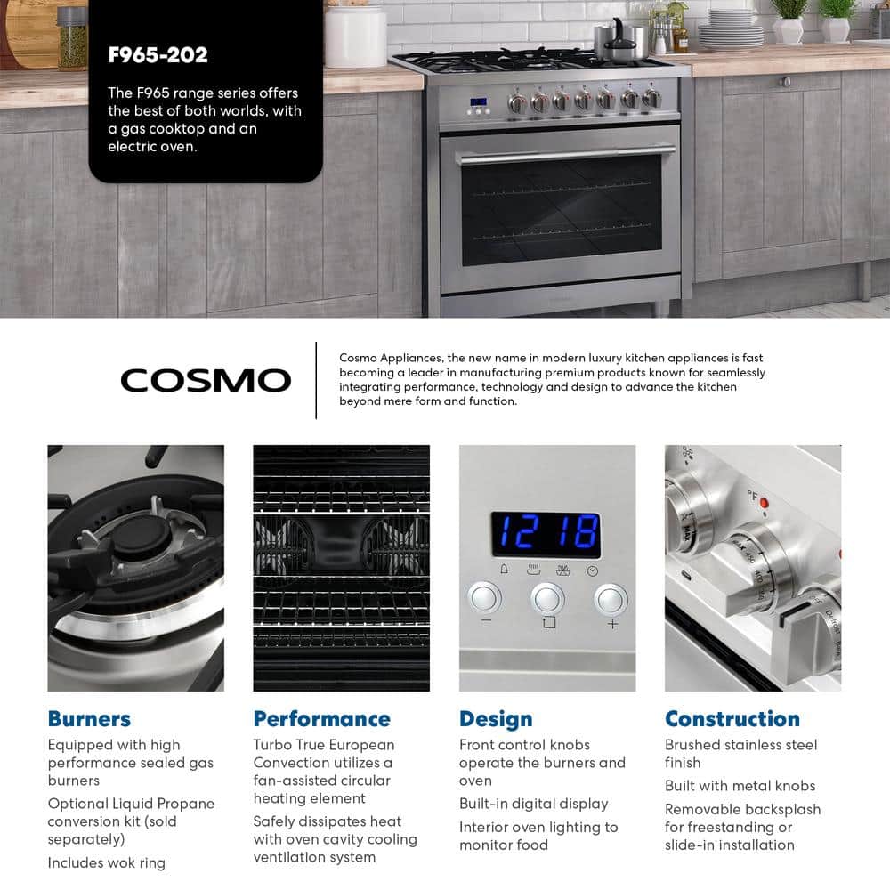 Cook for the whole family with less time and effort. Cosmo’s F965-202 36 in. Freestanding Single Oven Dual Fuel Range features a 5 sealed gas burner cooktop and a spacious 3.8 cu. ft. electric oven capacity. The sealed gas burners range from 5,000 BTU for precise heat and simmering delicate sauces to a powerful 18,000 BTU triple ring burner to provide high heat for cooking meat and boiling water. The 3.8 cu. ft. True European Convection electric oven has 8 functions, including defrost, pizza, and convection bake modes, to deliver perfectly cooked meals every time. Our gas range features overheating protection and a cool-to-touch oven door handle so you can cook with peace of mind. Thanks to the removable backsplash, this 36 in. dual fuel range can be used for either freestanding or slide-in installations. Trust Cosmo to deliver professional quality and design at factory direct prices. Includes 965-H02MCR ergonomic texutred grip handle which can be easilly installed for a sleek and stylish appearance. The Cosmo Stellar Collection offers reliability with essential features, providing a straightforward solution for those who seek practicality in an appliance.