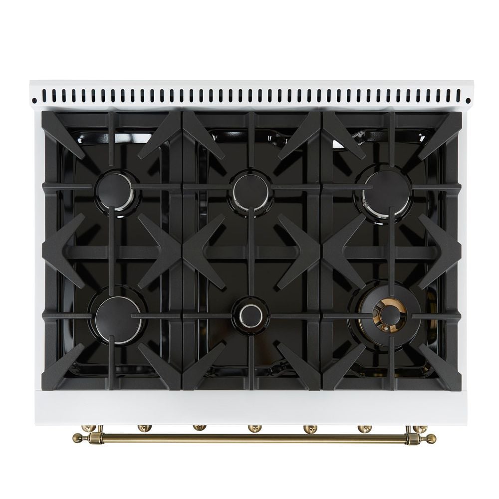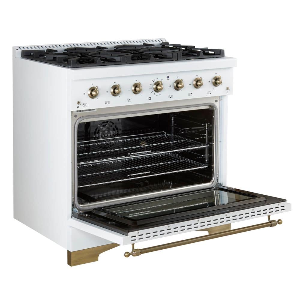 Discover the perfect blend of style and performance with the Antico 36 in. Dual Fuel Range. Designed for culinary enthusiasts, it features 6-sealed burners delivering a powerful 71,000 BTU, including a dual-ring brass burner with 20,000 BTU for searing and 1,000 BTU for simmering. The spacious 4.5 cu. ft convection oven ensures even baking and roasting, while the recessed enamel cooktop makes cleanup effortless. Finished in sleek white with antique brass accents, this range brings timeless elegance to your kitchen. Durable cast-iron grates provide stability and smooth cookware movement. Backed by a 2-year warranty, the Antico range combines professional-grade quality with vintage charm, making it the centerpiece of your culinary space.