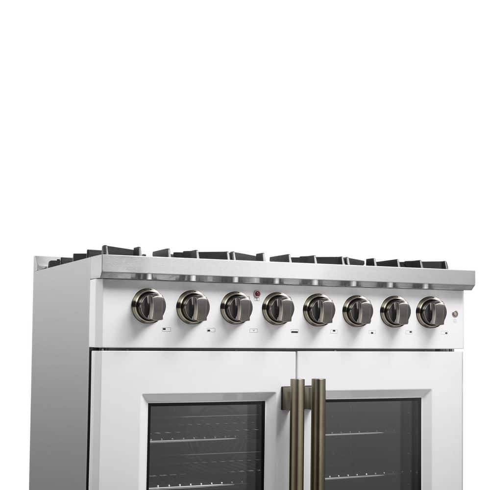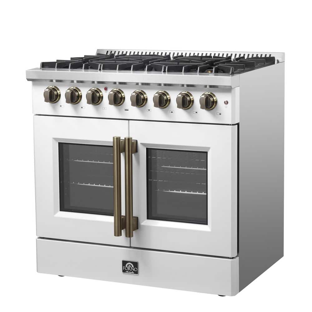 Forno Galiano 36 in. French Door Dual Fuel Range, White and Antique Brass, 5.36 cu. ft. True Convection Oven