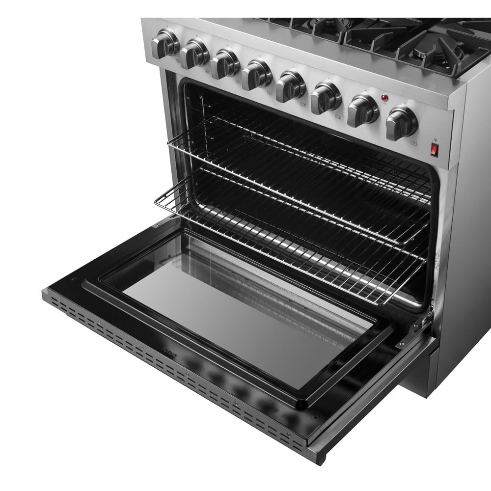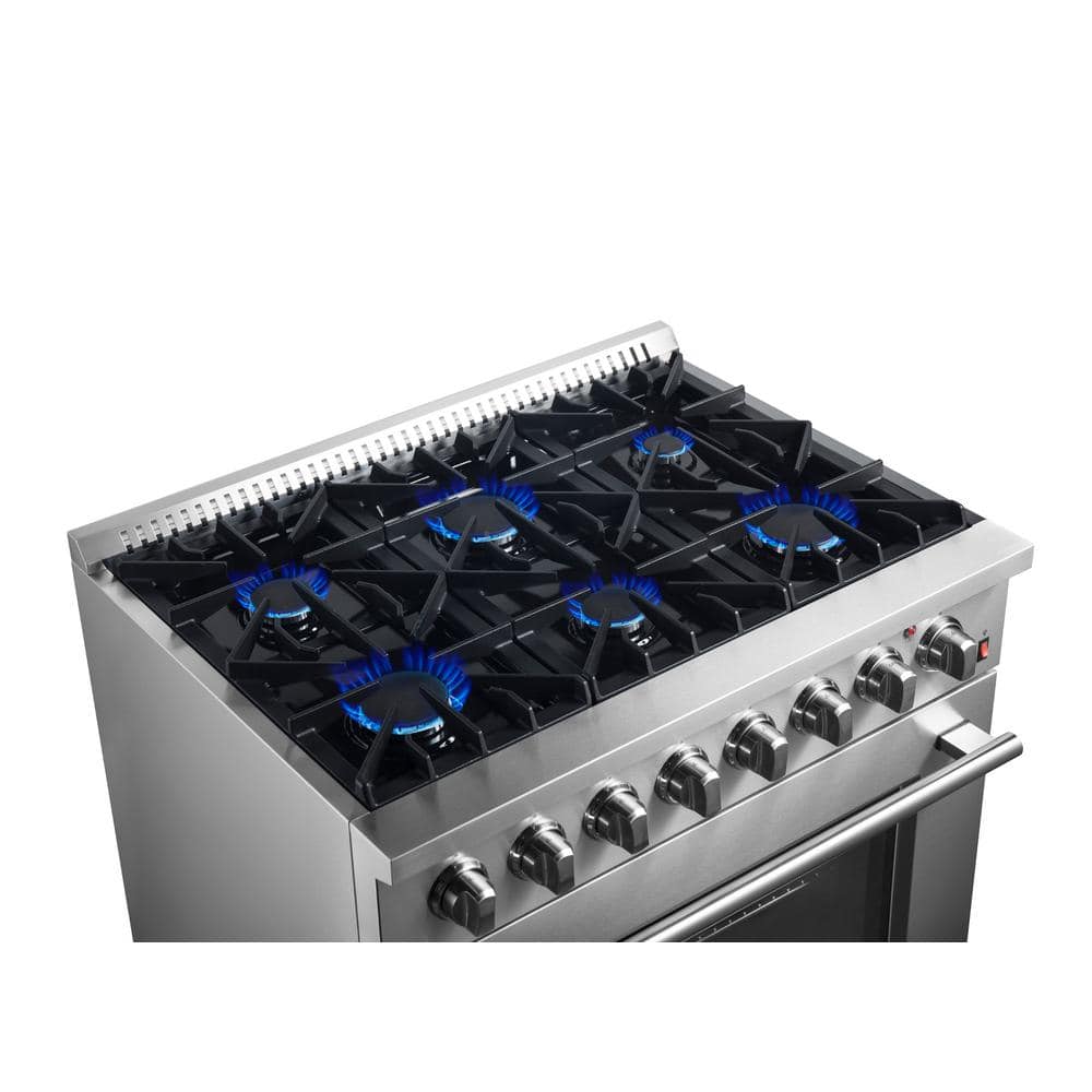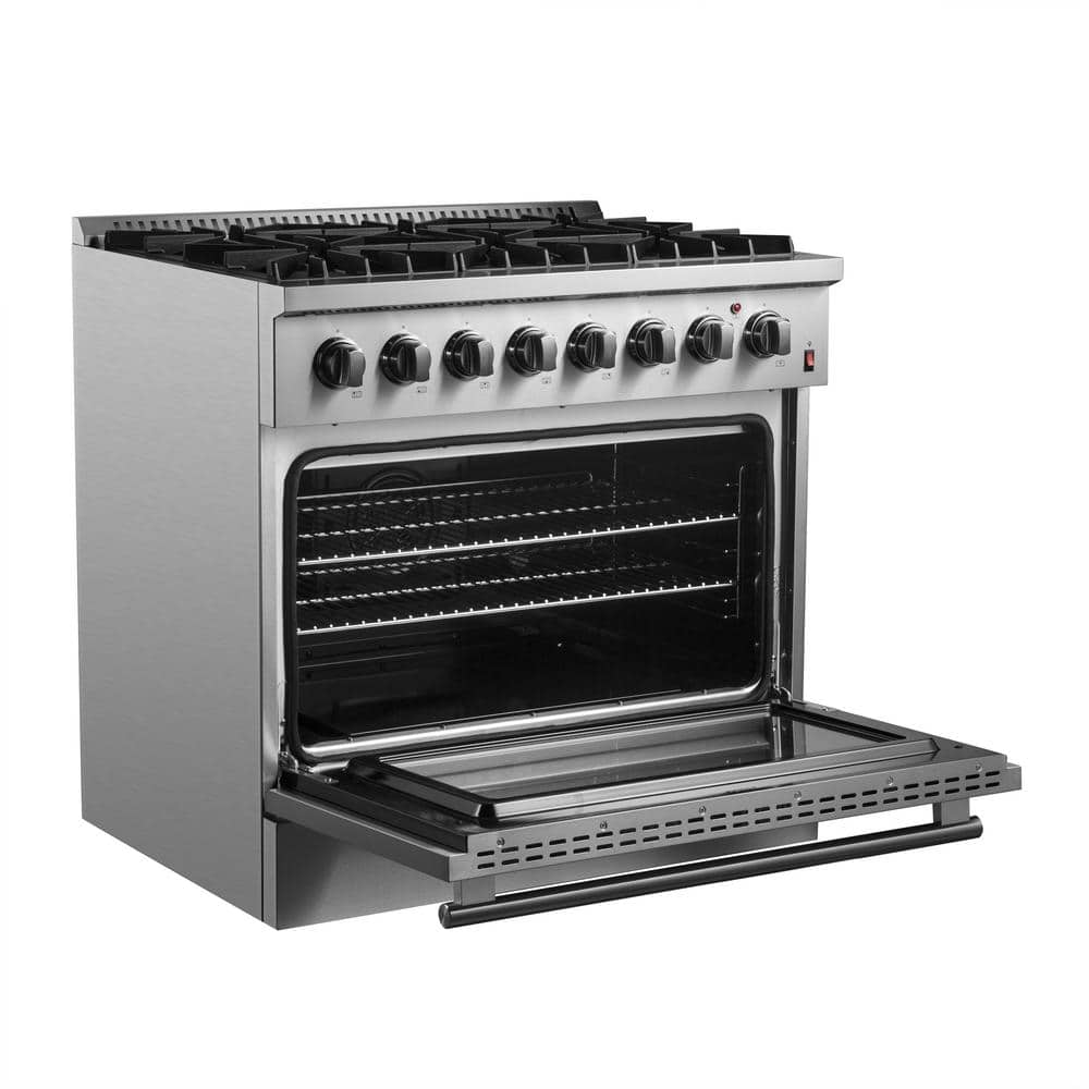 The FORNO Marco 36 in. Dual Fuel Range delivers pro-level styling and performance with its sleek stainless-steel design. The 67,000 BTU range top, featuring 6 sealed burners, offers everything from gentle simmers to powerful searing. Continuous cast iron grates ensure smooth pan transitions. The spacious 5.36 cu. ft. true convection oven features a 1500-Watt convection element and fan for precise, even cooking, while the dual-element broil ensures perfect browning. Its black enamel interior and halogen lights enhance visibility and make cleaning easy. With a hidden bake burner to prevent spills and odors, this range is built for convenience. It comes equipped with a NEMA 14-50P power cord and a 1/2 in. gas regulator for easy installation. Compatible with natural gas and propane (conversion kit included), this range combines durability, sophistication, and cooking flexibility. Lower the cost of living with FORNO.