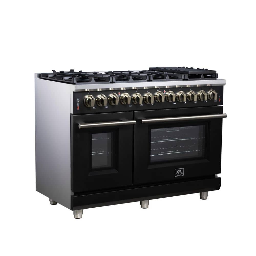 Forno Massimo 48 Inch Freestanding Dual Fuel Range in Black with Antique Brass Accessories, 6.58 cu. ft. Convection Oven