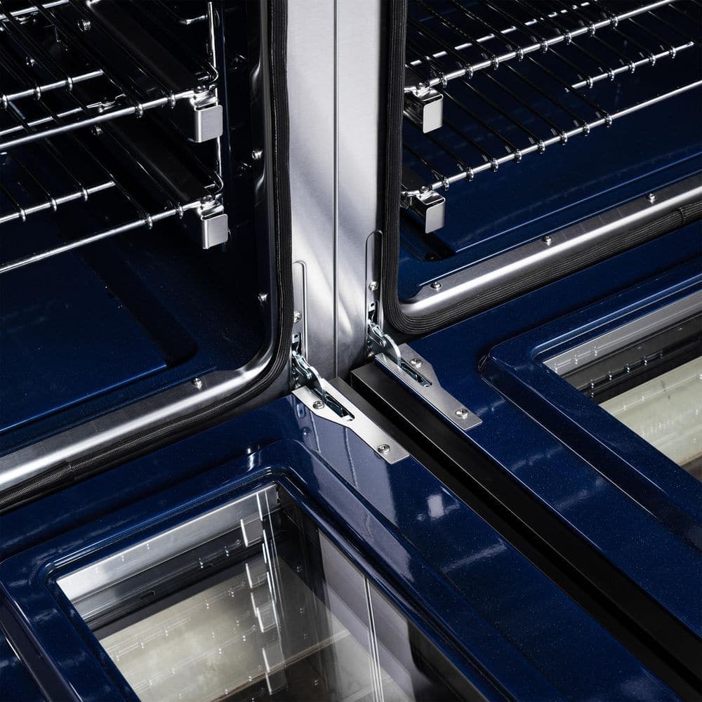 The Massimo 48 inch dual fuel range offers serious cooking power for high-performance kitchens. With 8 sealed gas burners and durable matte cast iron grates, it's built for everything from rapid boiling to low simmers. The spacious 6.58 cu. ft. electric oven features true convection, multiple bake and broil modes, and a built-in air fryer basket for healthier meals. Finished in a bold black with antique brass handles, it also includes a wok support, griddle, and a steam-cleaning function for easy maintenance. The speckled blue enamel oven interior adds style and visibility. LP convertible and designed for either freestanding or built-in installation.