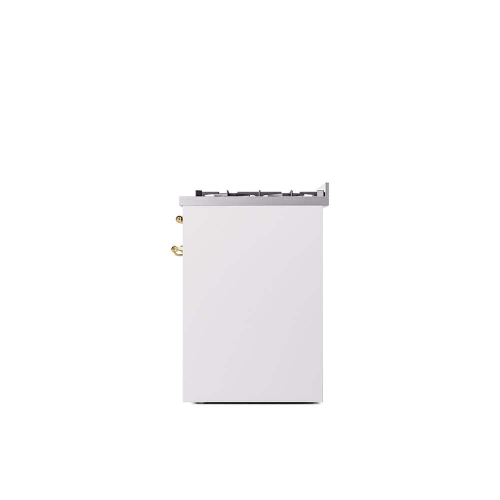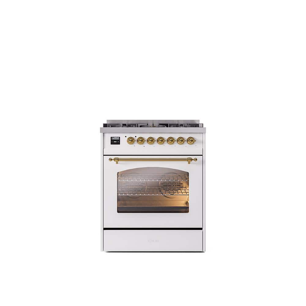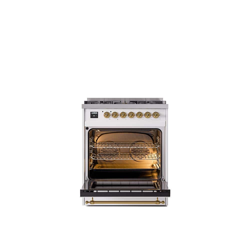 ILVE Nostalgie II 30 in. Dual Fuel Natural Gas Range with 5 Burners, Brass Trim in White