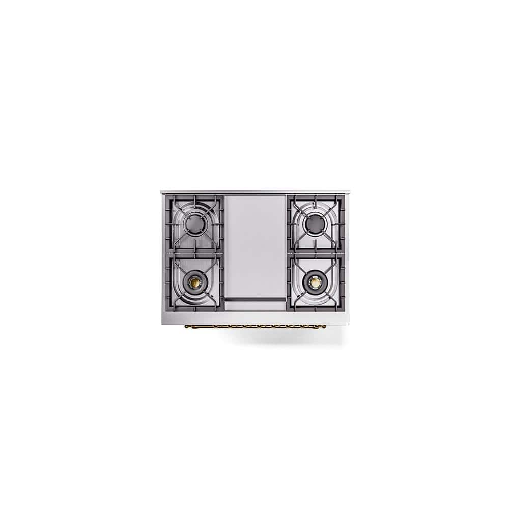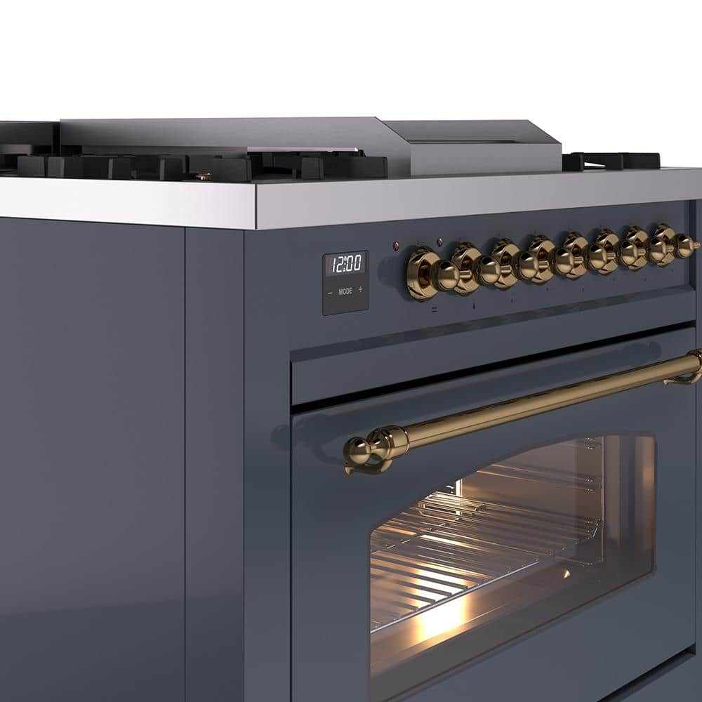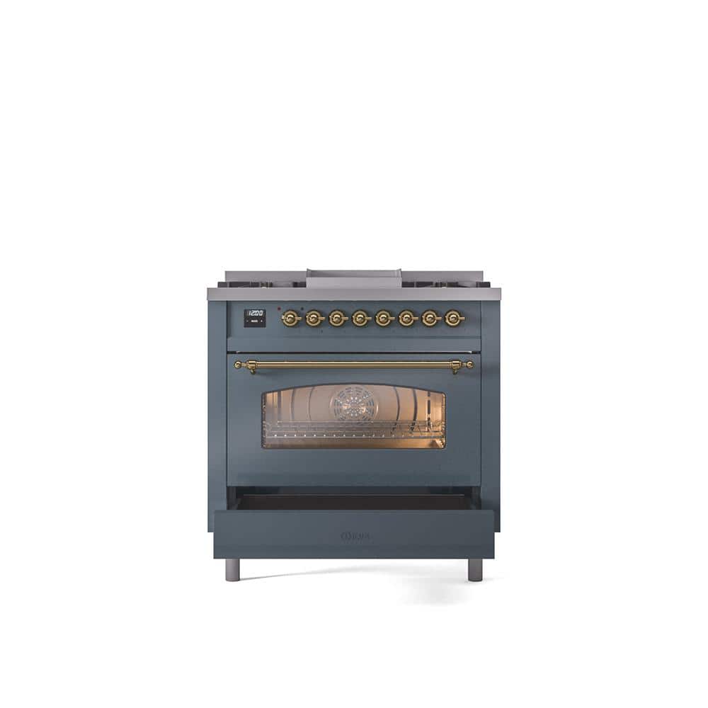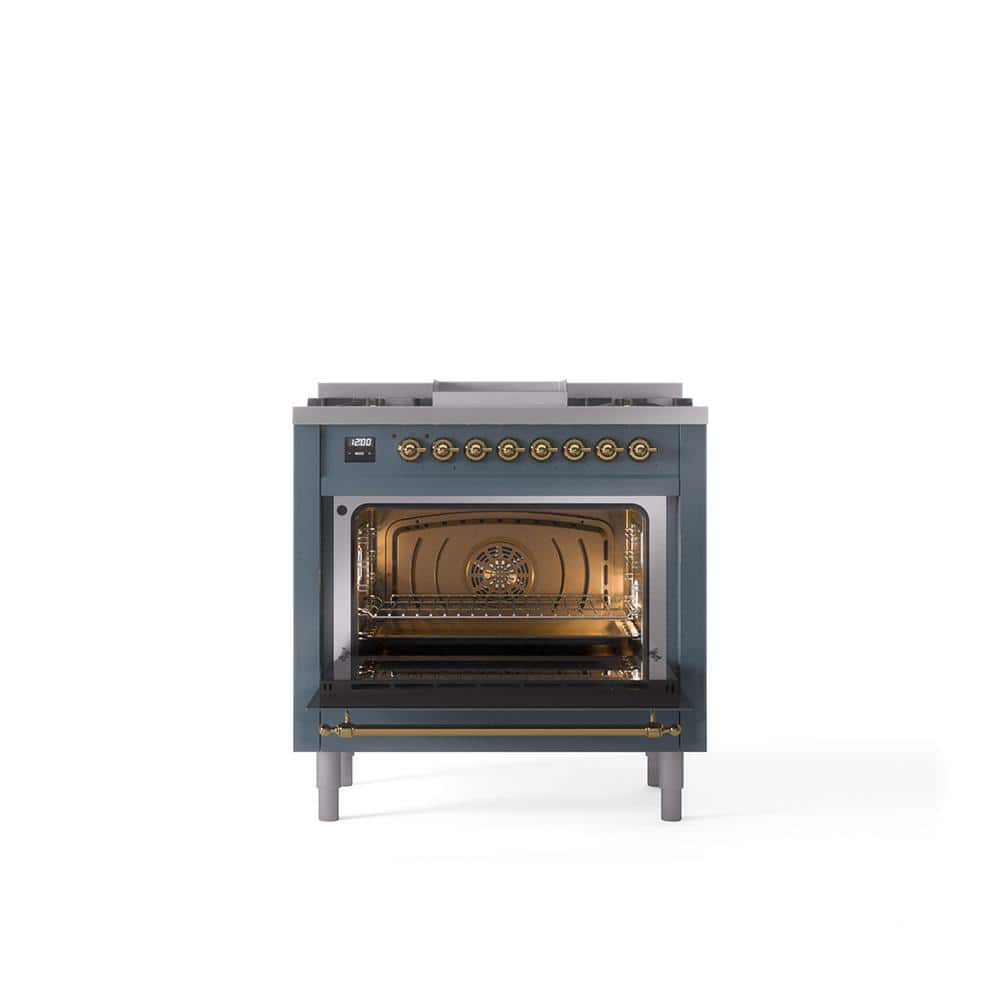 ILVE Nostalgie II 36 in. Dual Fuel Liquid Propane Range with 6 Burners, Griddle, Brass Trim in Blue Grey