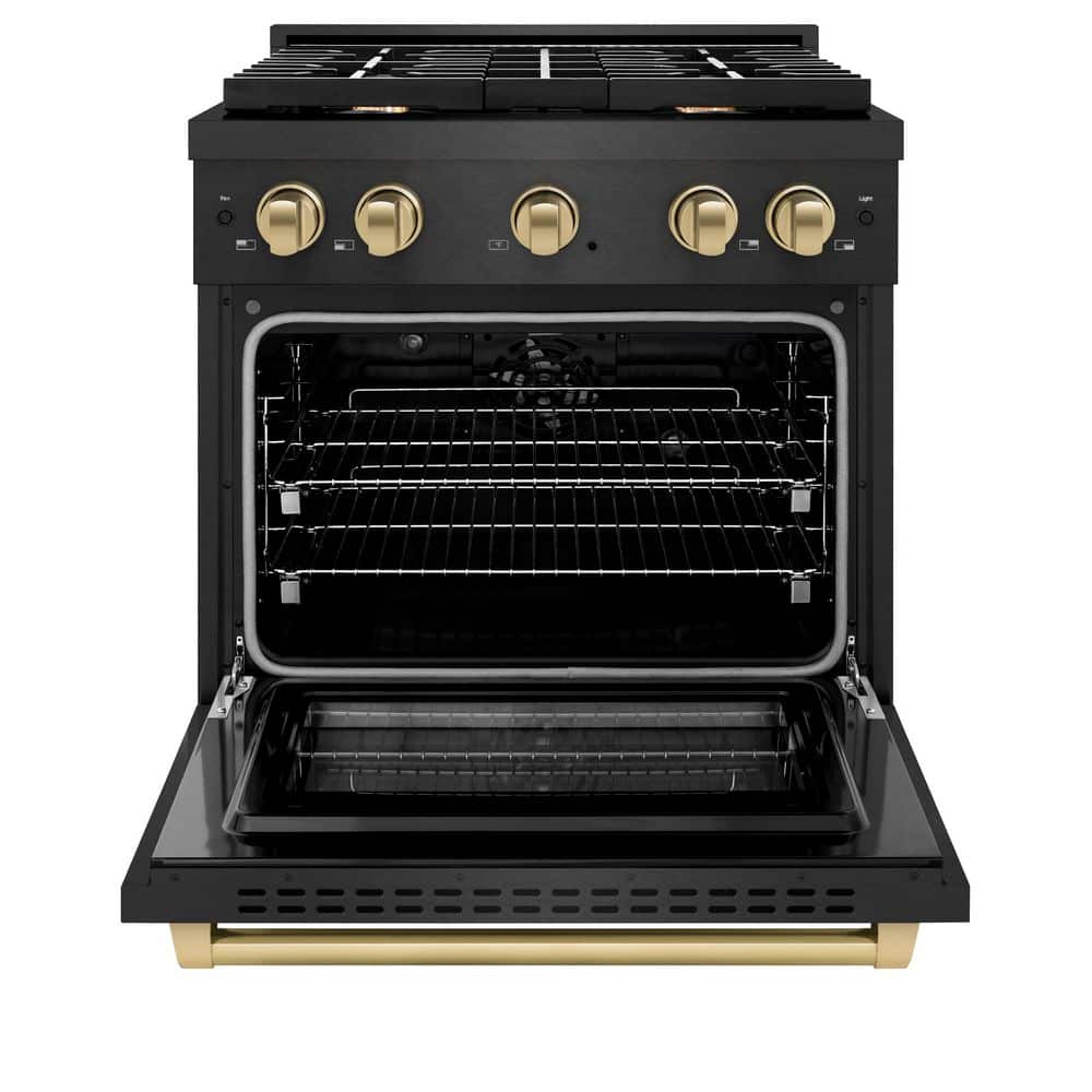 Luxury isn’t meant to be left desired it’s meant to be attainable. The ZLINE Autograph Edition 30 in. 4.2 cu. ft. Paramount Dual Fuel Range with 4 Burner Gas Cooktop and Electric Convection Oven in Black Satin Stainless Steel with Champagne Bronze Accents (SDRBSZ-30-CB) combines the versatility of a gas cooktop with 4 Italian-made auto-reignition burners, an electric convection oven with digital thermostat technology, enhanced cast iron grates, a Horizon oven door window design, and elegant champagne bronze knobs and handle allowing you to master every meal. With a modern, timeless style and refined functionality, ZLINE Paramount Dual Fuel Ranges are masterfully crafted to deliver an elevated culinary experience.