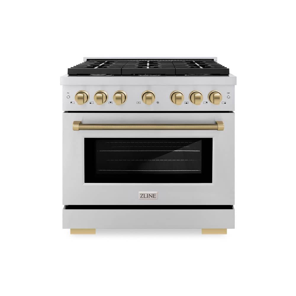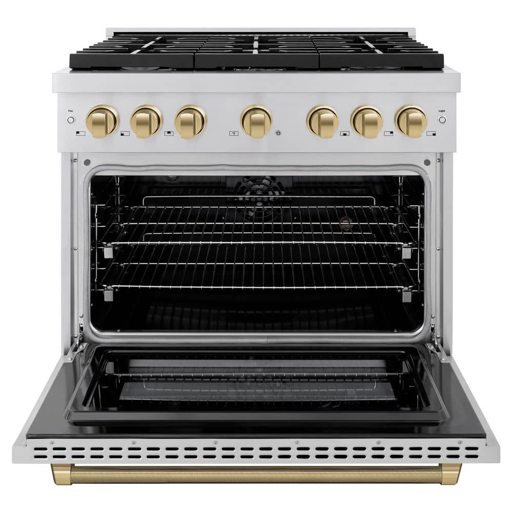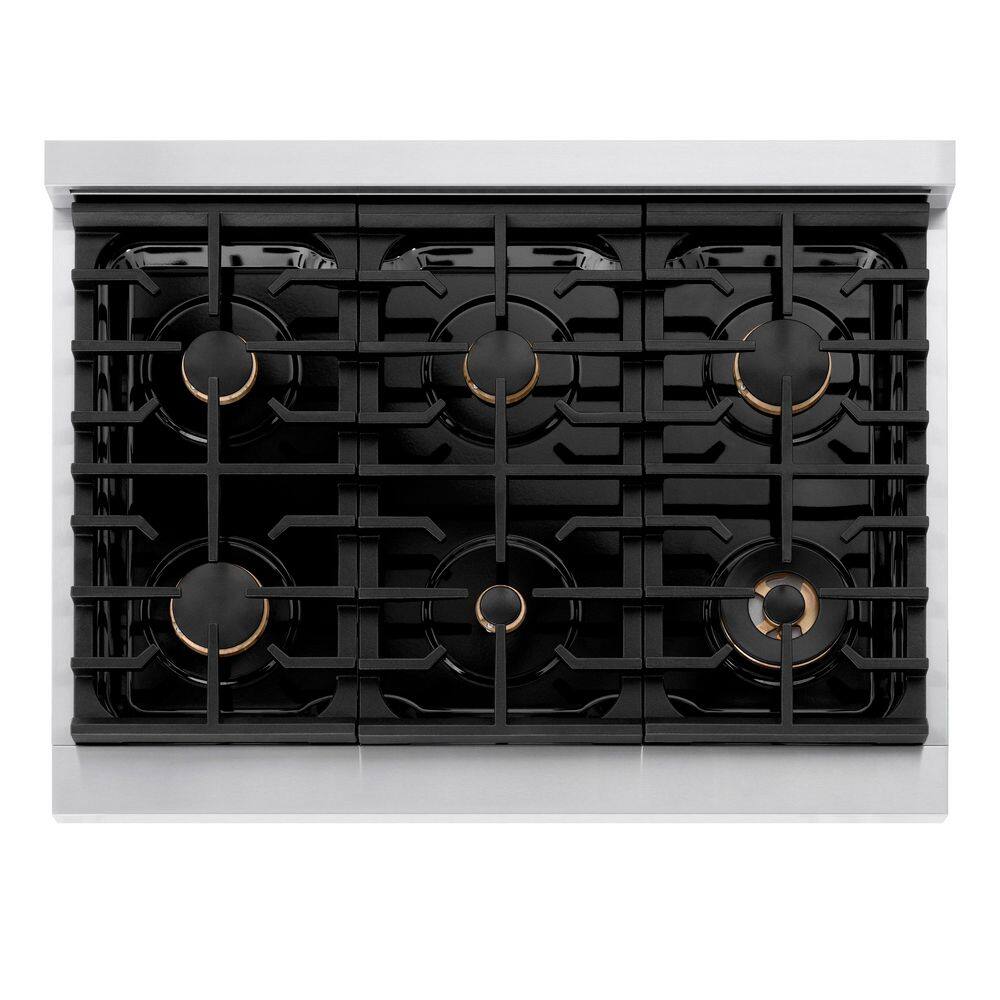 Luxury isn't meant to be left desired-it's meant to be attainable. The ZLINE Autograph Edition 36 in. 5.2 cu. ft. Paramount Dual Fuel Range with 6 Burner Gas Cooktop and Electric Convection Oven in Stainless Steel with Champagne Bronze Helix Handle and Knob Accents (SDRZ-36-KCB) combines the versatility of a gas cooktop with 6 Italian-made auto-reignition burners, an electric convection oven with digital thermostat technology, enhanced cast iron grates, and a Horizon oven door window design allowing you to master every meal. With a modern, timeless style and refined functionality, ZLINE Paramount Dual Fuel Ranges are masterfully crafted to deliver an elevated culinary experience.