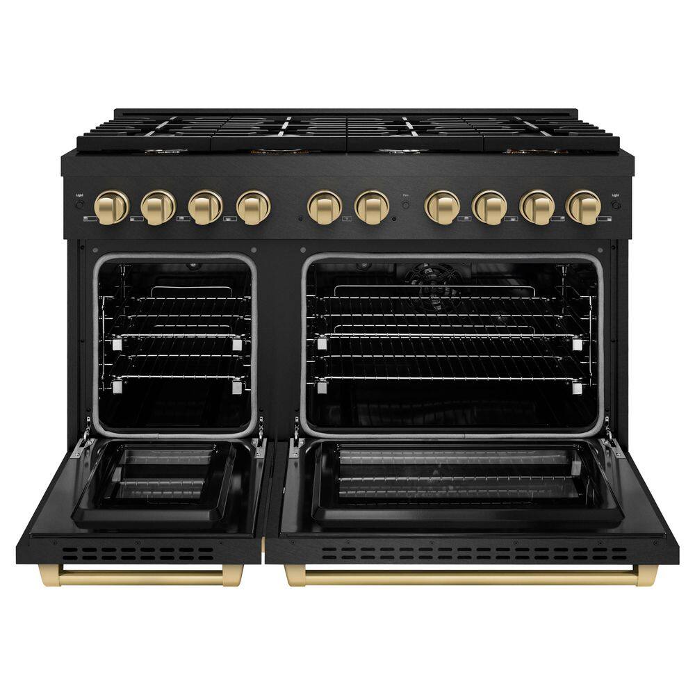 Luxury isn’t meant to be left desired it’s meant to be attainable. The ZLINE Autograph Edition 48 in. 6.7 cu. ft. Paramount Double Oven Dual Fuel Range with 8 Burner Gas Cooktop in Black Satin Stainless Steel and Champagne Bronze Accents (SDRBSZ-48-CB) combines the versatility of a gas cooktop with 8 Italian-made auto-reignition burners, a large high-performing electric convection oven and a small bake-and-broil oven with digital thermostat technology, enhanced cast iron grates, Horizon oven door window designs, and champagne bronze knobs and handles allowing you to master every meal. With a modern, timeless style and refined functionality, ZLINE Paramount Dual Fuel Ranges are masterfully crafted to deliver an elevated culinary experience.