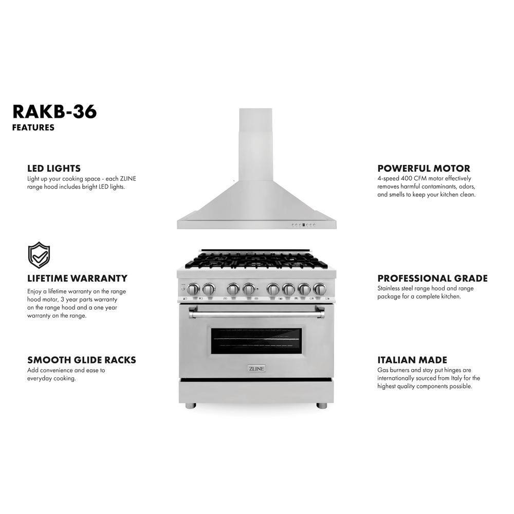 ZLINE Kitchen and Bath Stainless Steel Package with 36 in. 6-Burner Dual Fuel Range and 400 CFM Convertible Wall Mount Range Hood