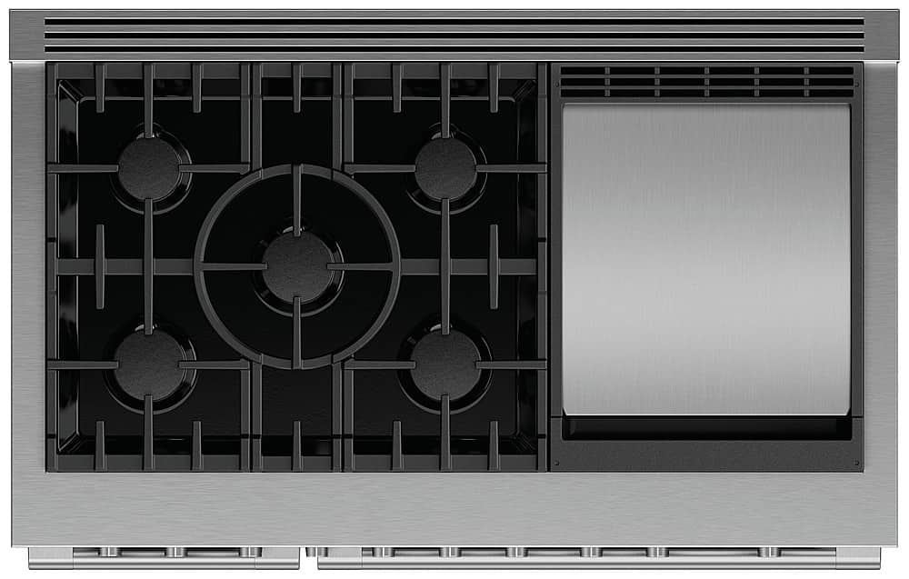 With Professional styling, this large range has five burners delivering powerful high heat, a griddle and two gas ovens. This range has craftsmanship in every detail, with real stainless steel, cast-iron trivets, and titanium coated dials. Each cavity features incandescent lights and full extension telescopic racks.