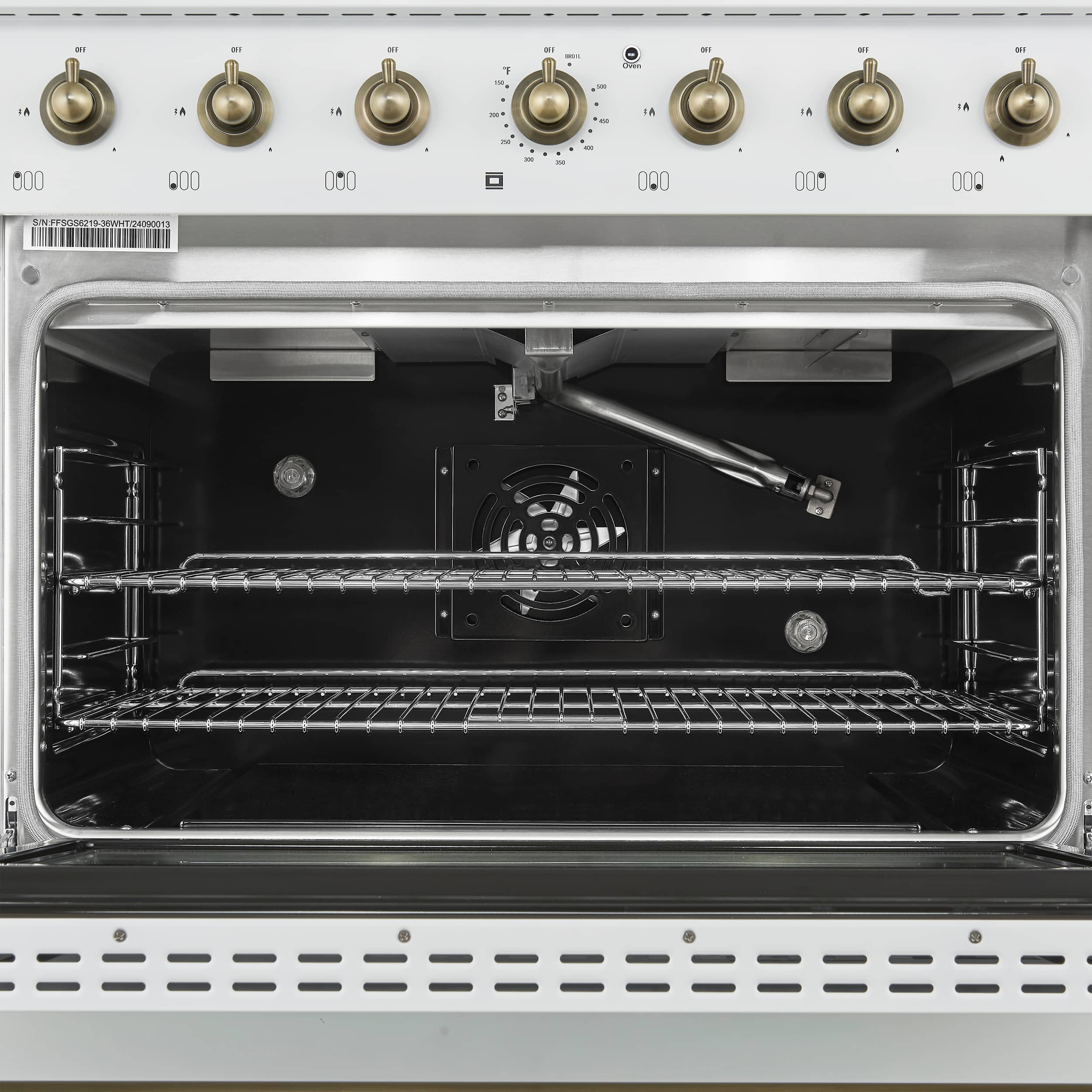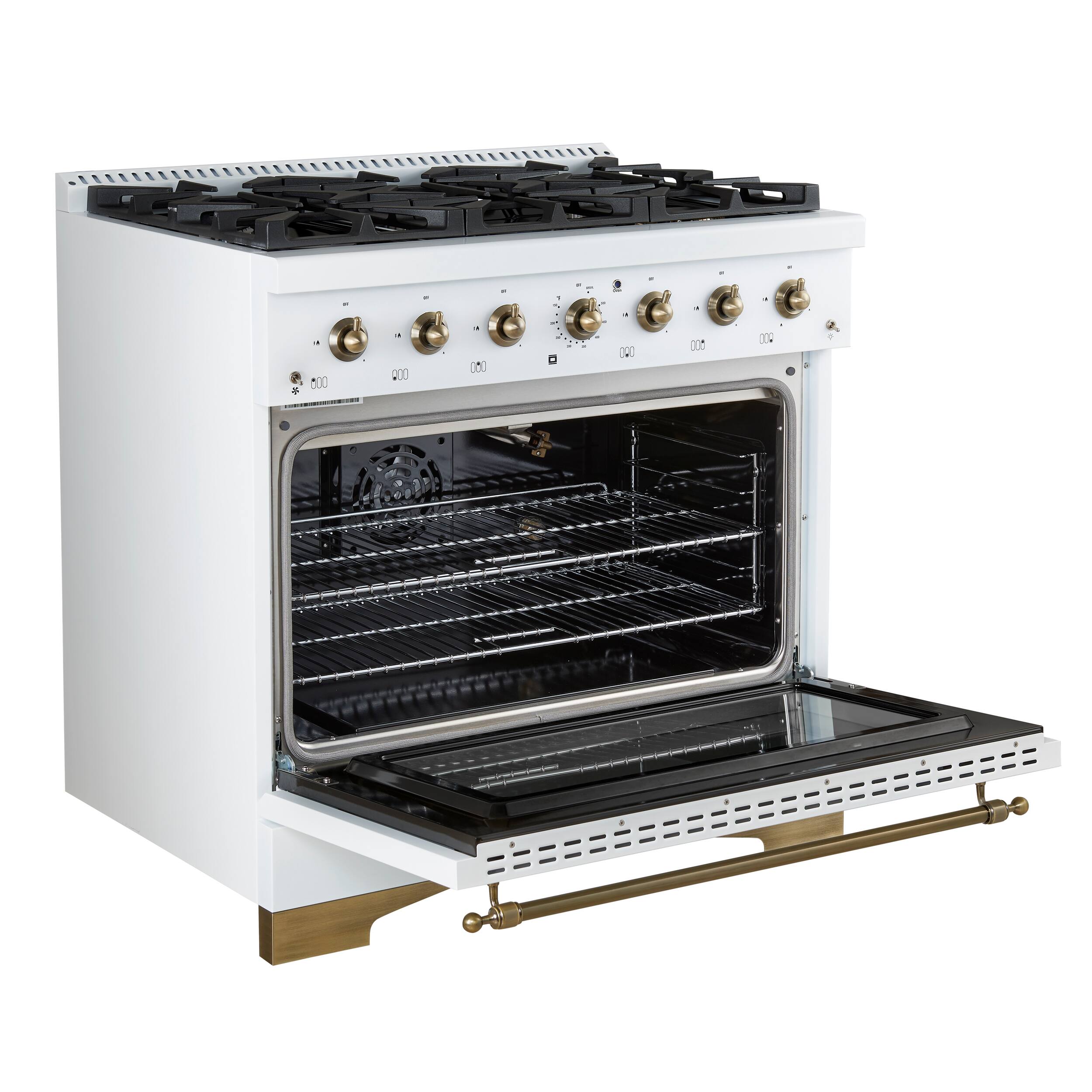 Discover the perfect combination of style and functionality with the Forno Antico 36-Inch Gas Range in white. Featuring 6 sealed burners with a total output of 71,000 BTU, this range delivers exceptional cooking power. The dual-ring brass burner provides up to 20,000 BTU for searing and 1,000 BTU for simmering, offering precise control for any dish. Its spacious 4.5 cu.ft. convection oven ensures even baking and roasting. With a sleek white finish and antique brass accents, this range adds timeless elegance to your kitchen. Continuous cast-iron grates provide stability, while the recessed enamel cooktop makes cleaning easy. Backed by Forno's 2-year warranty, the Antico Gas Range is designed to inspire your culinary creativity. Forno, lower the cost of living.