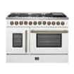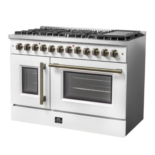 The Forno Galiano 48" Dual Fuel French Door Range in a crisp white finish with antique brass accents blends elegance and performance. Its 8 sealed burners deliver 107,000 BTU, including a 20,000 BTU dual-ring burner for precise control. Dual ovens offer a total 6.58 cu.ft. capacity: the 4.32 cu.ft. convection oven with 6,300-watt output ensures even heat, while the 2.26 cu.ft. oven adds versatility. French doors and a left-swing door simplify access, while durable cast iron grates and black enamel interiors ensure easy use and cleaning. Includes griddle and 2-year warranty.