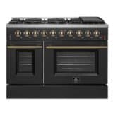 The 48-Inch Forno Galiano 6.58 Cu. Ft. Freestanding Gas Range with Convection Oven combines professional-grade performance with bold elegance. Featuring a sleek black finish accented by antique brass hardware, it brings a statement of style and durability to your kitchen. With 8 sealed burners delivering a total output of 107,000 BTU, including a 20,000 BTU dual-ring burner capable of simmering at 1,000 BTU, this range provides the versatility to handle any culinary challenge. Continuous cast iron grates ensure stability and effortless cookware movement on the durable enamel cooktop. Bake, roast, or broil with precision using the 4.32 cu.ft. convection main oven with 30,000 BTU total output for even heat distribution. The 2.26 cu.ft. secondary oven, featuring a 14,000 BTU bake output, allows you to prepare multiple dishes at once. Both ovens boast enamel interiors for effortless cleaning and three-layer glass doors for superior heat retention and visibility. Convenience meets functionality with two racks per oven, a reversible griddle, and an LP conversion kit for flexible installation. Backed by Forno's 2-year warranty, this gas range delivers powerful performance, enduring style, and complete peace of mind.