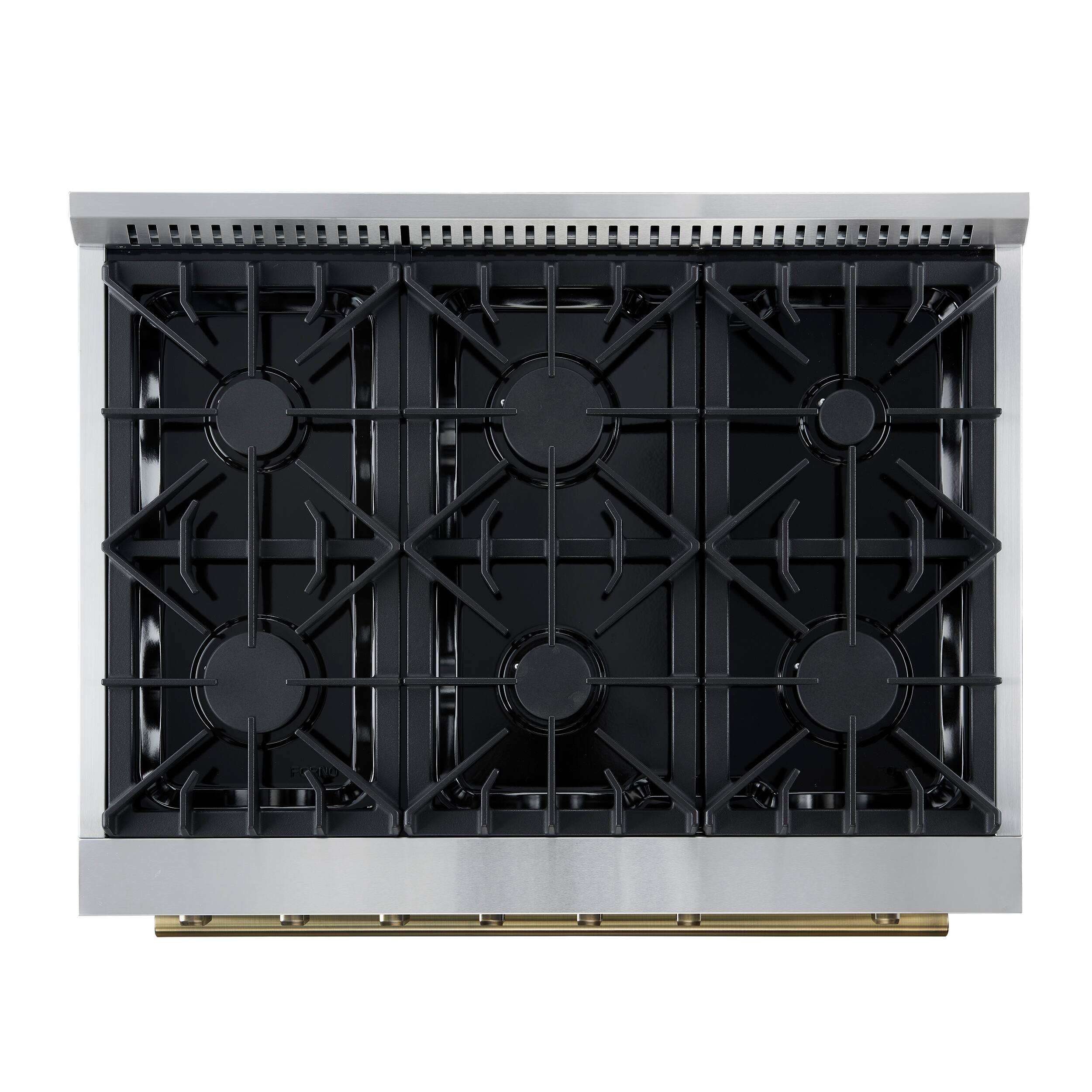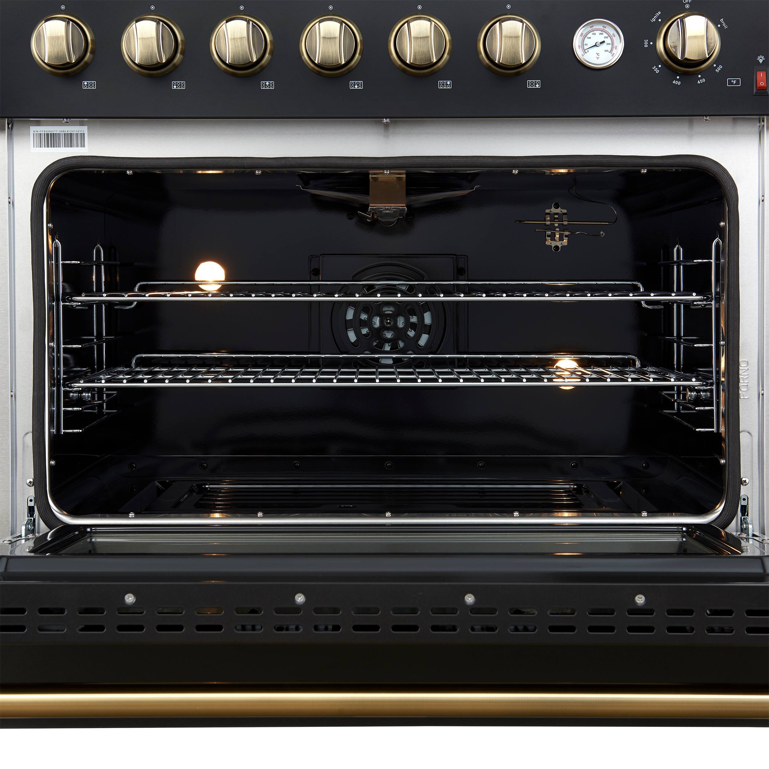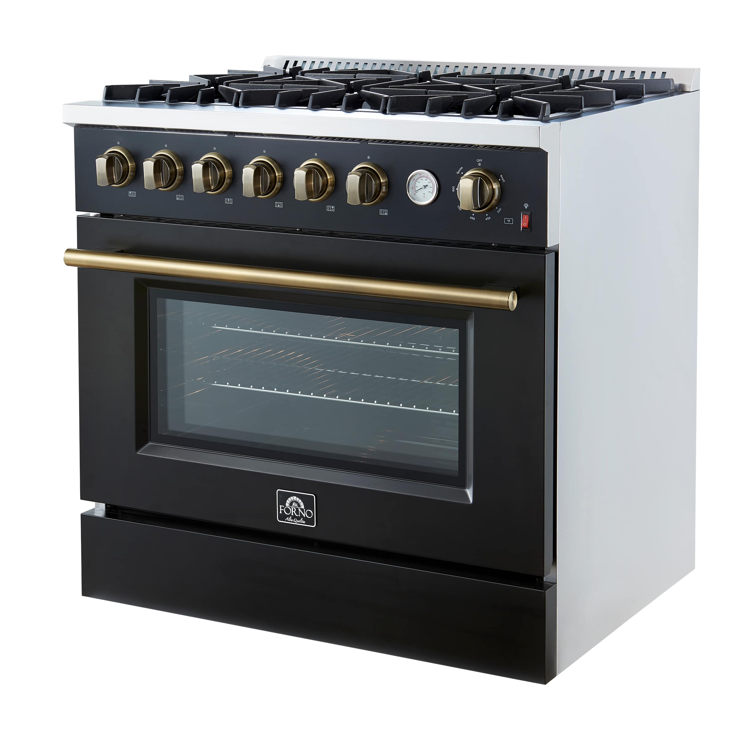 Make a statement with the Forno Marco 36 Inch Gas Range in sleek black and antique brass. This premium appliance features 6 sealed burners with 67,000 BTU output, catering to every cooking need, from gentle simmering to intense searing. The 5.36 cu.ft. convection oven ensures precision and even cooking for large roasts, casseroles, or baked goods. Designed for convenience, it includes durable oven racks and features a hidden bake burner for effortless cleanup. The bold design, coupled with outstanding performance, makes this range a standout addition to your kitchen. Lower the cost of living with Forno.