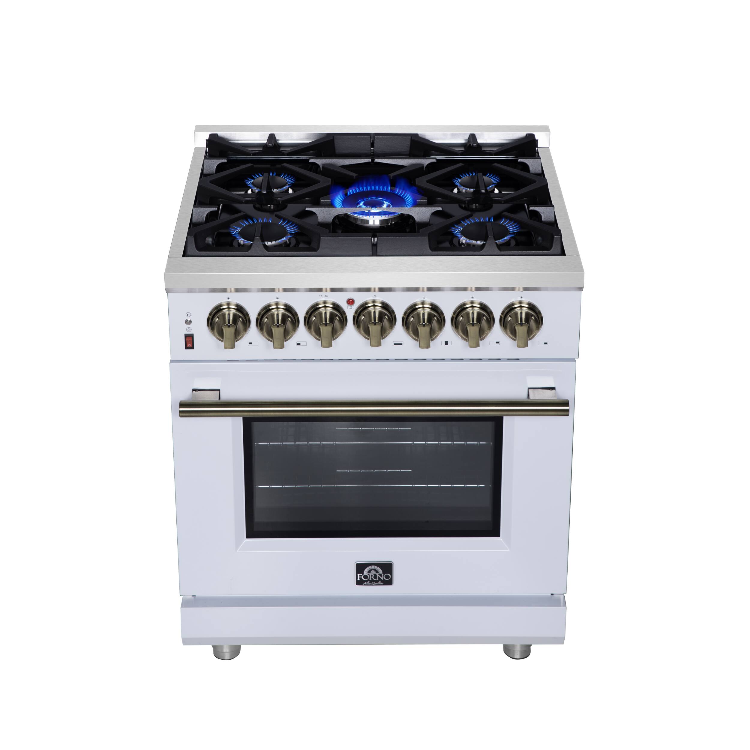 Forno's Massimo 4.32 Cu. Ft. Freestanding Dual Fuel True Convection Range delivers powerful performance with elevated style. It features six sealed gas burners and matte cast iron grates, plus included accessories like a wok ring and removable griddle. The 5.36 cu. ft. electric oven offers true convection cooking, dual-element broiling, and five baking modes for maximum versatility. Designed in a sleek white finish with antique brass handles, this range includes a built-in air fryer basket, steam-clean oven, and a speckled blue enamel interior. LP gas convertible and suitable for both freestanding or built-in installations.