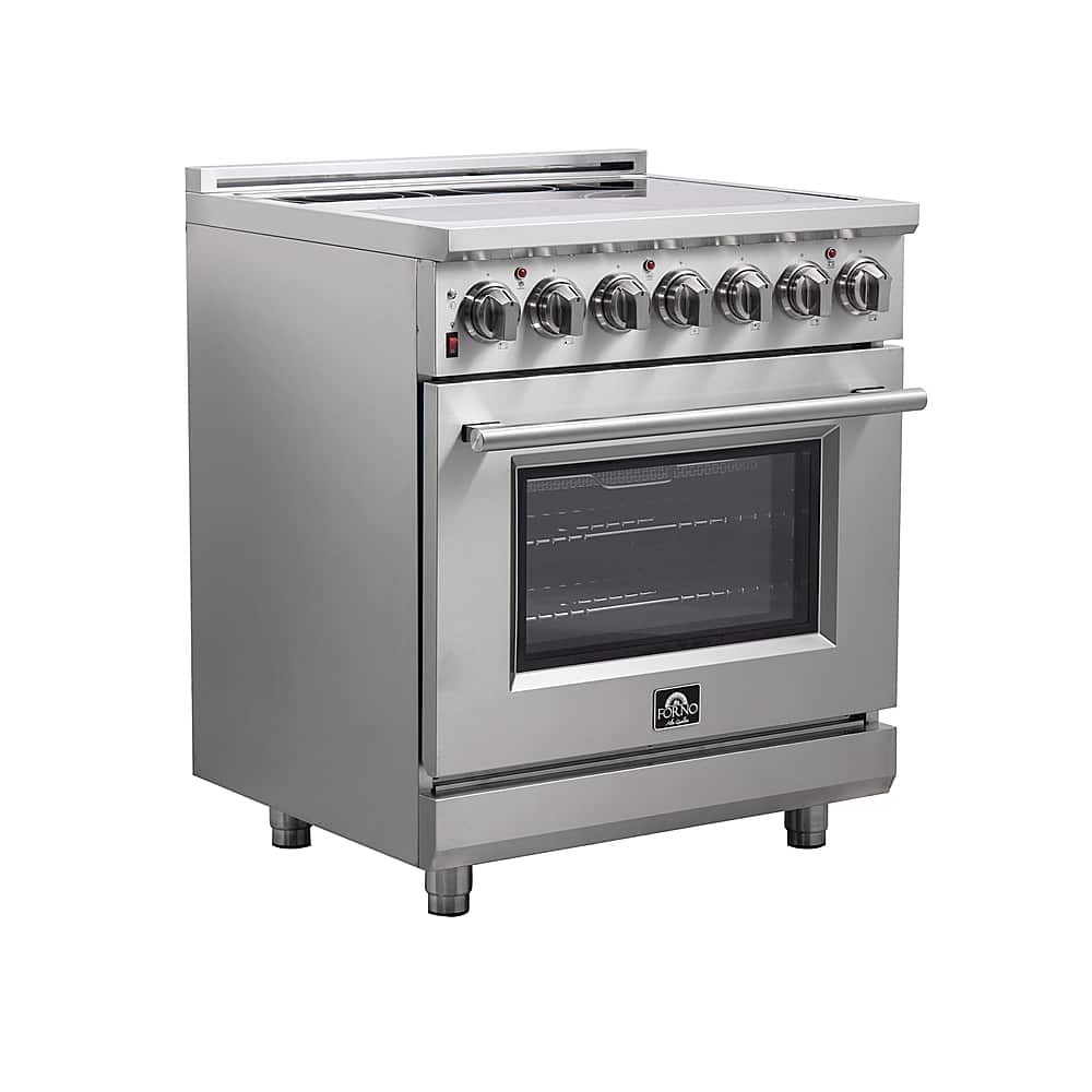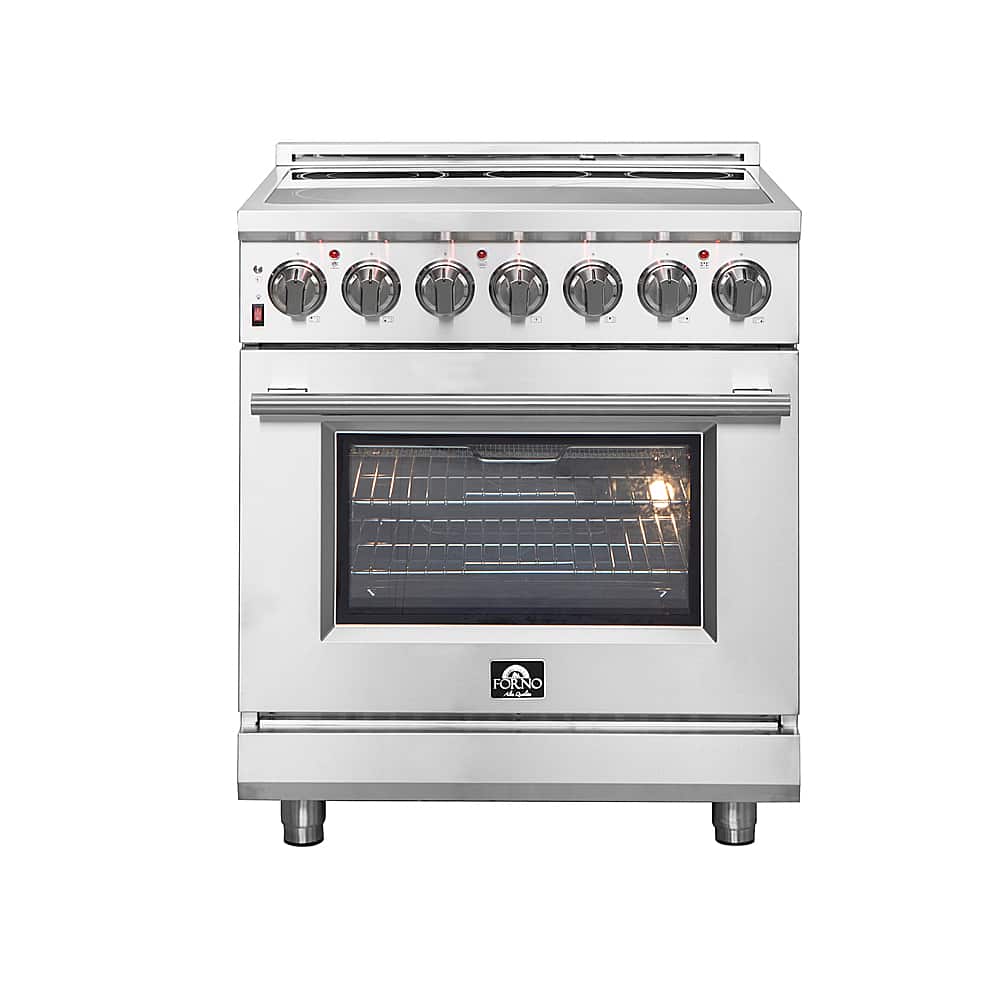 The Forno Massimo 4.32 Cu. Ft. Freestanding Electric Range brings professional styling and quality into your home kitchen with its durable stainless-steel design. The cooking surface has 5 radiant elements with a total output of 9,500 watts and also features a warmer zone of 100 watts that you can count on to always keep your dishes at the ideal temperature. The cooktop surface is surrounded with a heavy duty stainless steel to ensure long-lasting durability. The 4.32 Cu. Ft. capacity oven has a total broil and bake output of 4800 watts in addition to a 1500 watt true convection fan. An air fryer basket, rack and drip pan, two telescopic oven racks and a 4-prong power cord are all included. This all-in-one culinary solution is housed in a high-grade stainless steel body with zinc coated metal knobs and bezels, sporting a sleek and stylish look that is built to last. All Forno products are backed by an iron clad 2-year warranty for your satisfaction. Skip the high price tags without sacrificing quality and performance and lower the cost of living with Forno.