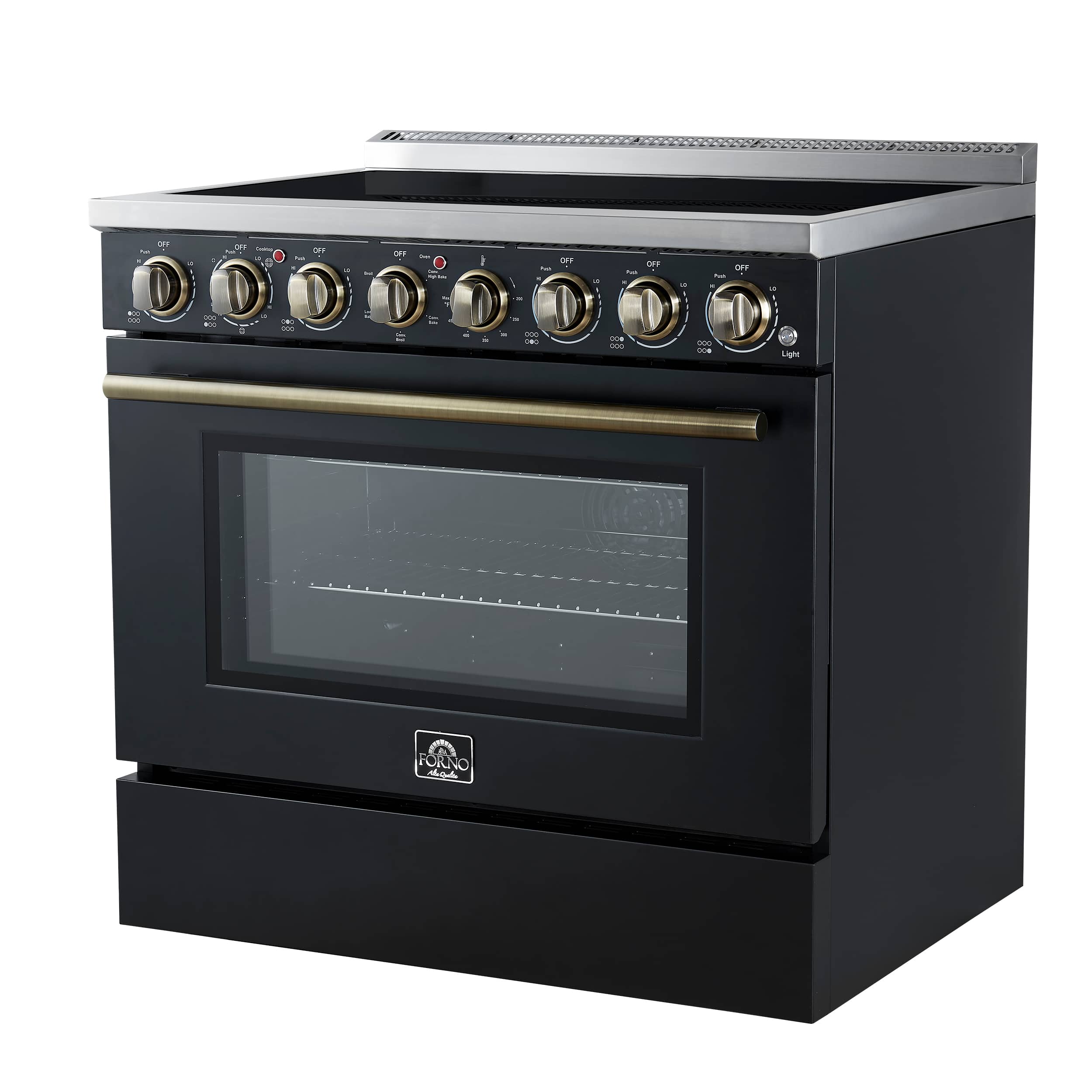 The Forno Paolo 36 Inch electric range in black with antique brass knobs and handles combines power and style for the modern kitchen. Its smooth ceramic glass cooktop features five radiant elements with 9,800 watts of total output. The 5.44 cu. ft. true convection oven delivers fast, even results with a 1,200-watt fan and 3,000-watt high-powered baking and broiling elements. A hidden bake element, bright halogen lights, and a large viewing window add convenience. This freestanding electric range also includes a 100-watt warming zone and dual-element broiler for precise, high-heat cooking.