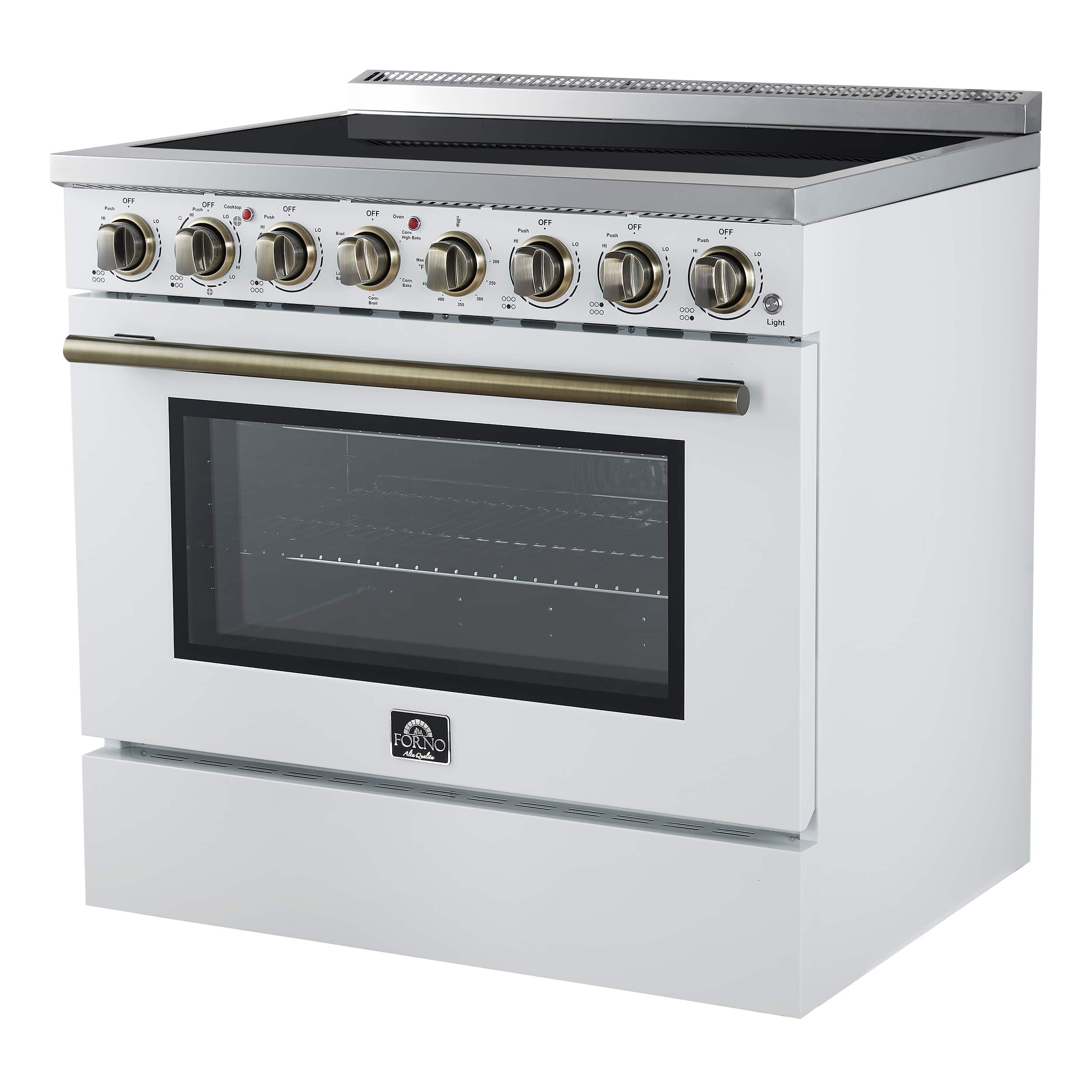 The Forno Paolo 36 Inch electric range in white with antique brass knobs and handles combines power and style for the modern kitchen. Its smooth ceramic glass cooktop features five radiant elements with 9,800 watts of total output. The 5.44 cu. ft. true convection oven delivers fast, even results with a 1,200-watt fan and 3,000-watt high-powered baking and broiling elements. A hidden bake element, bright halogen lights, and a large viewing window add convenience. This freestanding electric range also includes a 100-watt warming zone and dual-element broiler for precise, high-heat cooking.