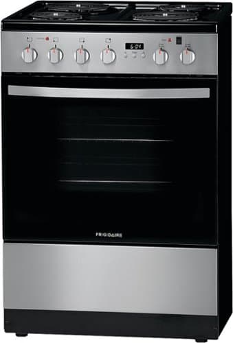 Cook family-size meals with this stainless steel Frigidaire 24-inch electric range. The 1.9 cu. ft. capacity holds a full-size turkey, and the four burners support the preparation of sauces and side dishes. This 1650W Frigidaire 24-inch electric range features a storage drawer for quick access to cookware, while the viewing window lets you monitor the cooking process.