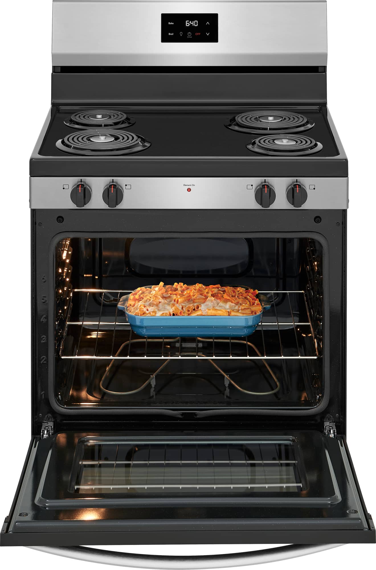 This Frigidaire 30 in. Freestanding Electric Range offers a 5.3 cu. ft. capacity oven and a 4-element electric cooktop featuring two 8 in. and two 6 in. coil elements, so you can cook more at once. The cooktop includes indicator lights that let you know when it's still hot, while the large oven window allows you to easily monitor food as it bakes.