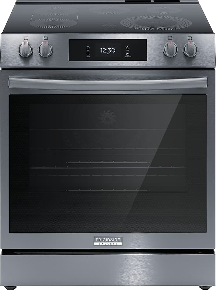 Frigidaire Gallery 6.2 Cu. Ft. Freestanding Electric Convection Range with Self Clean and Air Fry features a powerful and advanced convection system, which enables cooking modes like No Preheat, Air Fry, Slow Cook, Steam Bake, Steam Roast, Air Sous Vide, Convection Roast, Convection Bake, Bread Proof and more! The flexible five element cooktop includes a powerful 3,200 Watt EvenTemp element and a convenient bridge element. This range also features backlit LED knobs, our premium touch screen digital control panel and our fingerprint resistant, Smudge-Proof Black Stainless Steel finish.