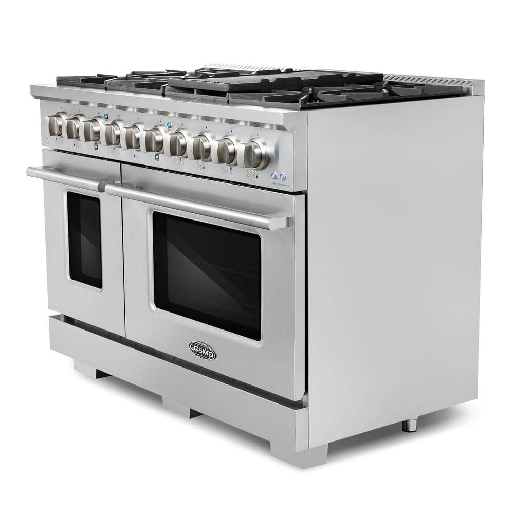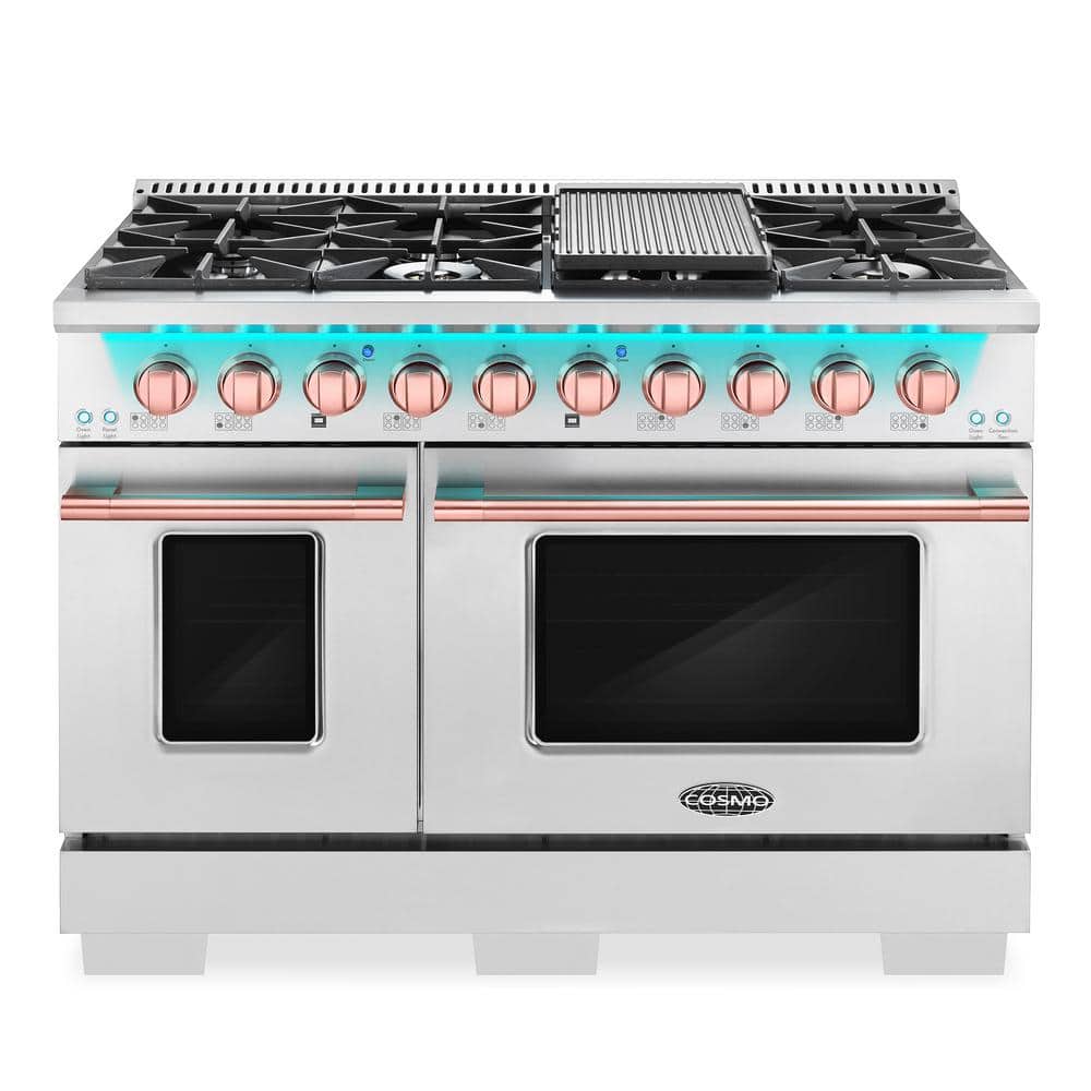 Discover a new world of cooking with Cosmo's luxurious and powerful double oven gas range kitchen stove. The 48 in. range features 8 sealed Italian-made burners to handle all your pots and pans with ease. A large 3.5 cu. ft. main oven lets you bake for a crowd, with a convection fan designed to distribute heat more evenly to eliminate cold spots. A secondary 2 cu. ft. oven equipped with standard bake allows you to cook multiple courses at once, saving valuable time in the kitchen. Six special oven functions give you the precision to create everything from juicy roasts to delicate desserts. Designed for durability, this 48 in. gas range is constructed with industrial, corrosion-resistant 304-grade stainless steel. A removable backsplash means this range is suitable for either freestanding or slide-in installation. Custom Knob and Handle Appliance Packages in Rose Gold and Black are sold with Installation Kits needed to be installed by customer. A better home starts with Cosmo.