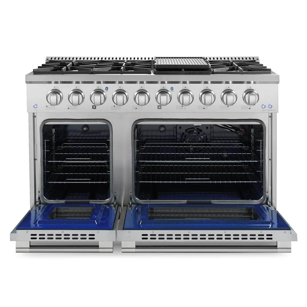 - Commercial-style 48 in. 5.5 cu. ft. double oven gas range